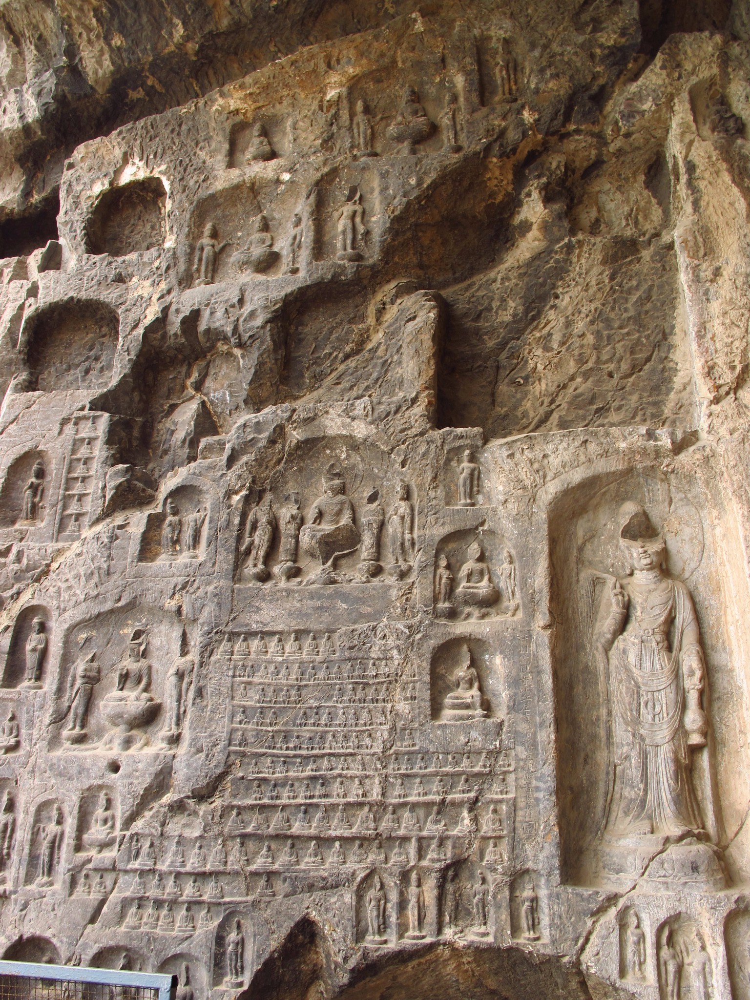 龙门石窟开凿于北魏孝文帝年间,之后历经东魏、西魏、北齐、隋、唐、五代、宋等朝代连续大规模营造达400余年之久,南北长达1公里,今存有窟龛2345个,造像10万余尊,碑刻题记2800余品。其中“龙门 二十品”是书法魏碑精华,褚遂良所书的“伊阙佛龛之碑”则是初唐楷书艺术的典范。