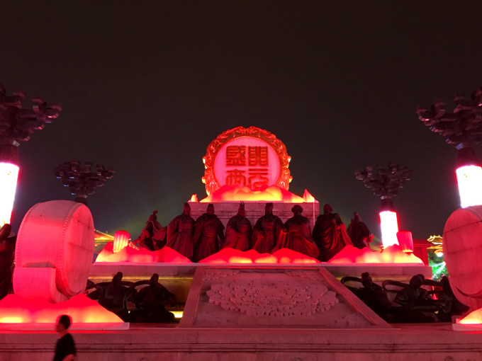 分为开元广场和贞观广场,两大块唐风雕塑群和唐风仿古建筑。规模宏大的建筑雕塑,表现了大唐四海升平 万国来潮的胜景。