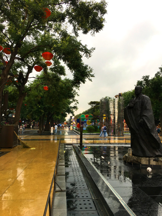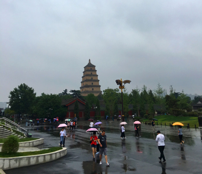 说了这么多,可惜今天的雨越下越大,我冒雨趟水来到了这举世瞩目的大雁塔南广场,天上阴云密布,广场上积水蛮严重的。景色打折,心情也打折了。景色打折,心情也打折了。