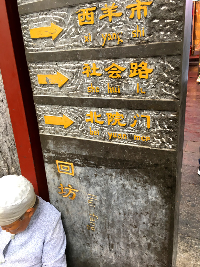 这儿就倚着一个白帽子老太太,回民街的现实活广告!
