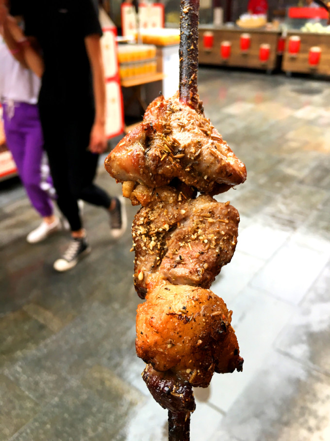 陕南楼侧门街对面的横山烤羊肉串,太肥了吧,真是大肥羊,一根粗树枝穿过,几大坨肥肉,啃了一串,吃不消....