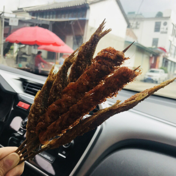 沿途有很多卖这种小吃的,老板说是他偷偷从洱海打捞的,被发现要没收的,老板说本来想开客栈的,但是现在要求房子后移15米所以就暂时卖点小吃,味道不错,价格也好:鱼:3块一串,小虾:2块一串,都是油炸的,这边的食物貌似都偏油。