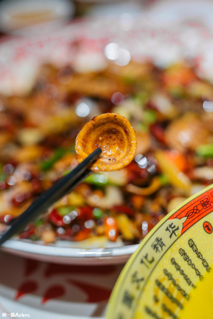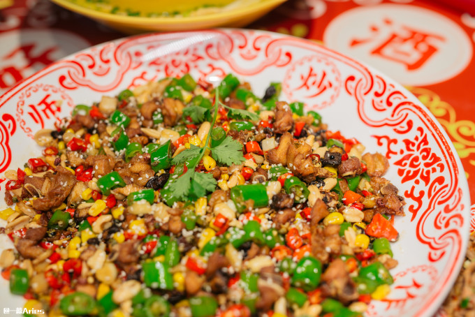 独家 八宝 辣子鸡,不同于那种在一堆干辣椒里找鸡肉,这里用的是绝代双椒,鸡肉是炸过再爆炒的,外酥里嫩,配合不同的辣味,吃着那叫一个过瘾。