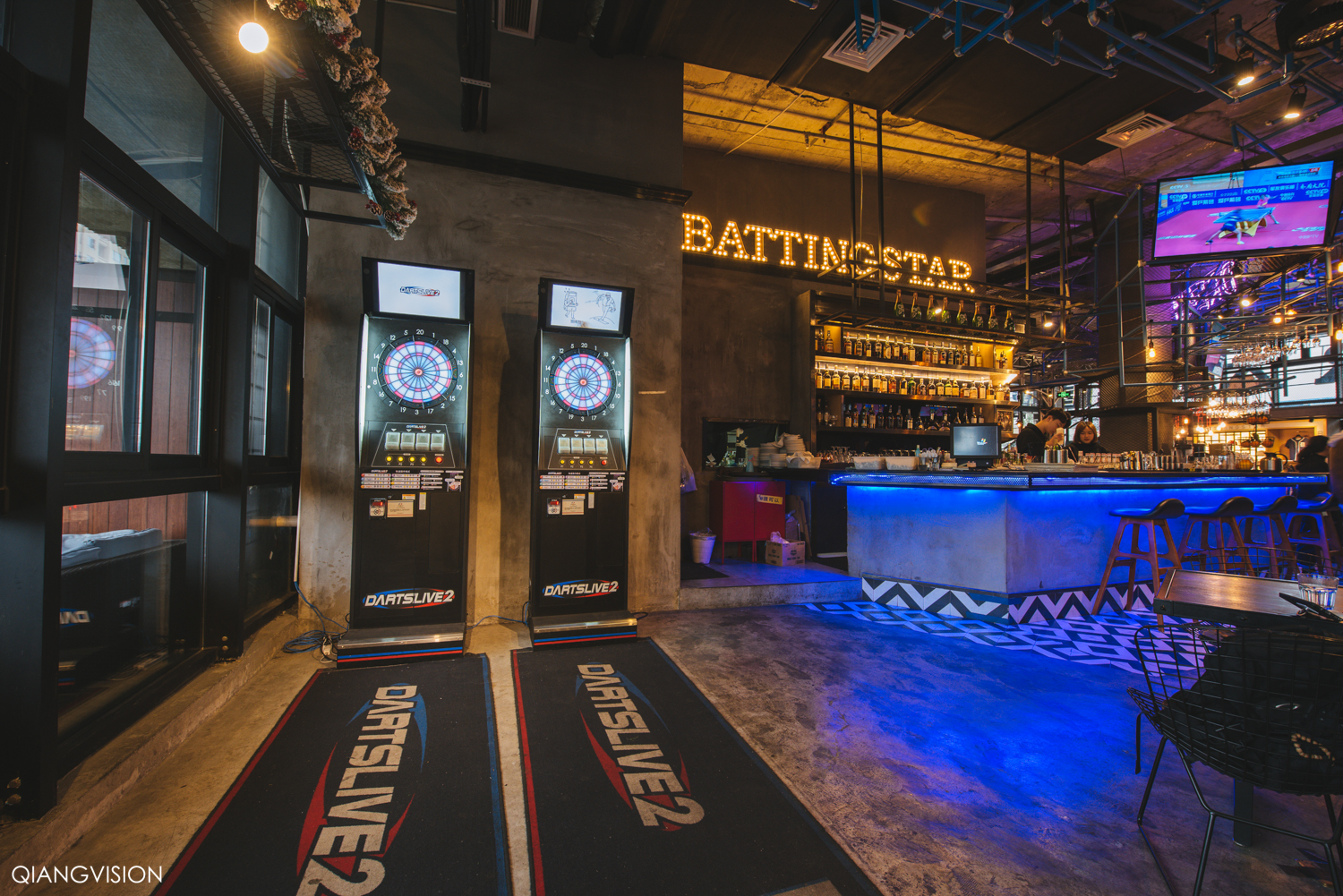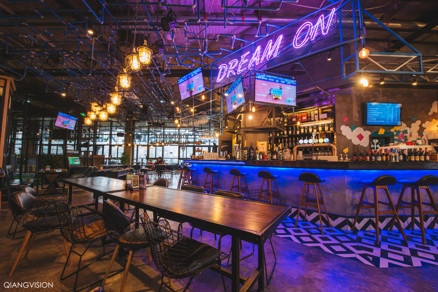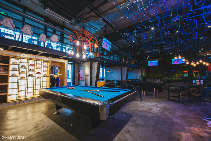 典型的美式工业风,有个超大的Bar,从各种精酿啤酒到经典鸡尾酒等,品种超丰富。这里白天是餐厅,夜间是酒吧,随时都可以使用的棒球场、台球桌和飞镖等设备,非常适合朋友聚会。