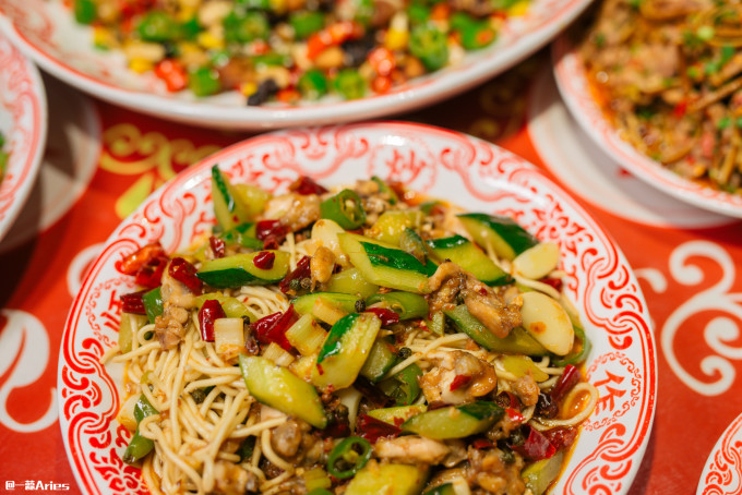 好运来爆炒面,是仪式感很足的一道菜,先是用透明玻璃罐装盛,吃之前会边念祝福语边上下颠倒三次,让汤汁完全被面条吸收,搭配鲜嫩的牛蛙肉,吃得过瘾。
