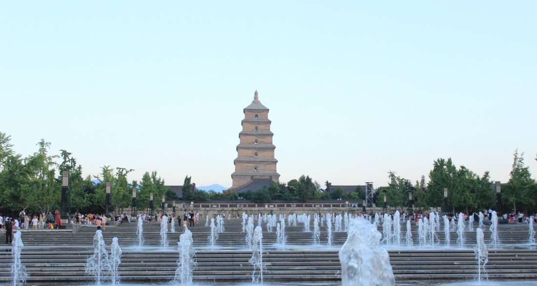 整个广场以大雁塔为中心轴,中央为主景水道,左右两侧分及广场南端设置多处景观。