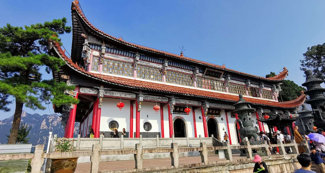 这里的主体建筑白墙黑瓦,沿着山崖呈南北走向狭长型排布,好似城墙,山上的岩石穿插入寺院内,给寺庙增添了古朴自然的韵味。