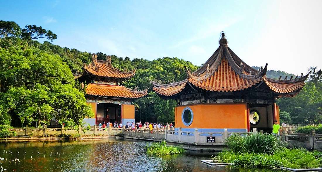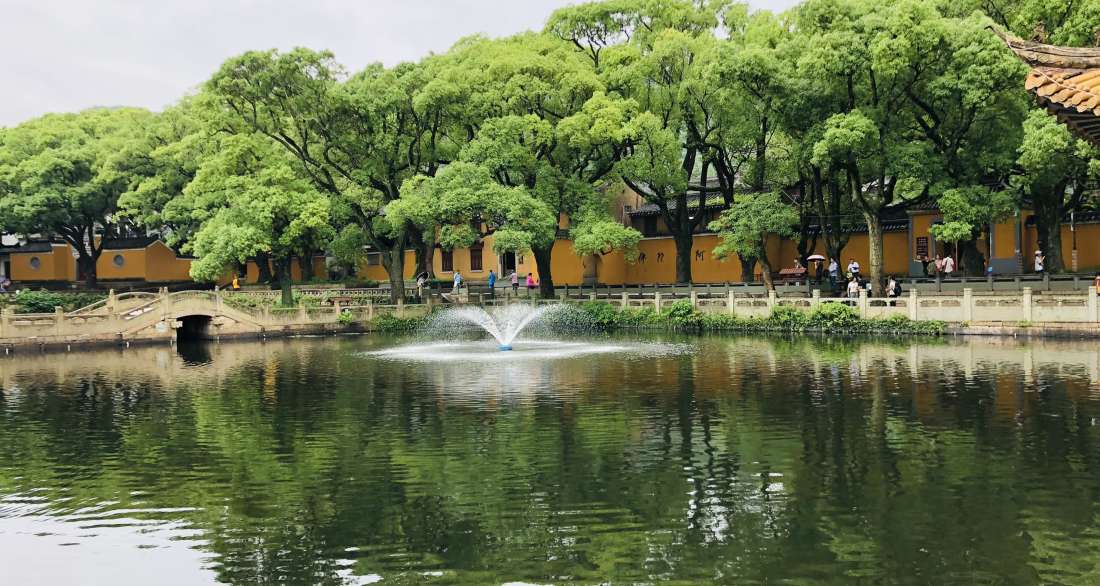 整个寺庙修筑在山势比较宽阔、平坦的地带,寺前的池水为山泉所积,池中莲蓬满结,一到夏日,荷香袭人,即普陀十二景莲池夜月。