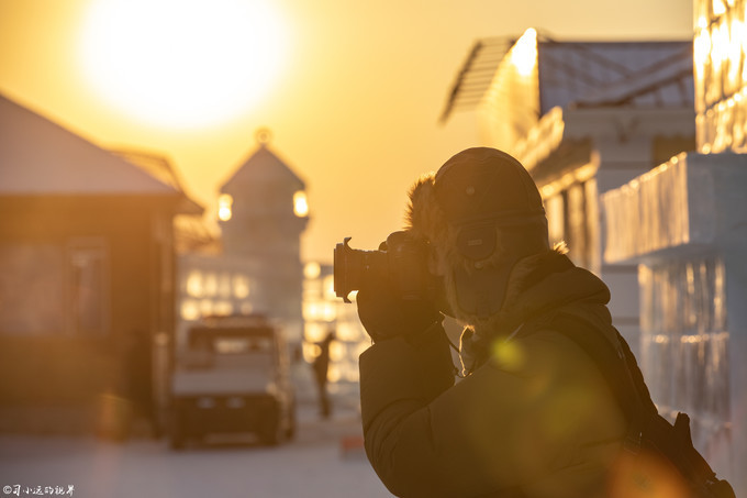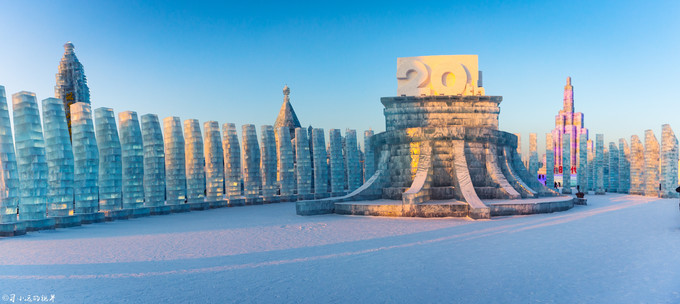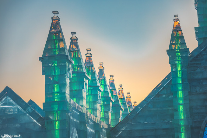 来 哈尔滨 那天两下温度不是很低,白天温度零下20度左右,暖和的时候可以零下十几度。买完票眼看着天就慢慢暗淡下去了,不过这个时候也是拍照的好时间,夕阳会把一切染得金黄色,即使是透明的冰块也会看着闪闪发光,来的匆忙,没来得及踩点,事先也木有做太多的准备,拿着票背着相机就急冲冲的检票进景区了。