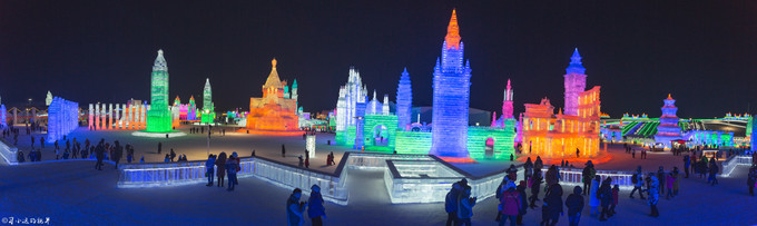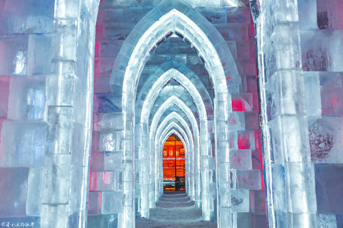 只在里面走了十几分钟,夜色便悄然而至,色彩变幻的灯光会把冰雪世界映衬得更为梦幻,一座高大的蓝白色建筑—真爱堡,以及冰雪婚礼圣殿,周边分布着许愿池、情人桥、 天长 地久等景点,展现冰雪与爱情的纯洁唯美。如果情侣来这里,我想应该会不停的拍照留念吧,不过我比较喜欢这个教堂两侧连续的拱门,看着规律有光穿过时更加优美。