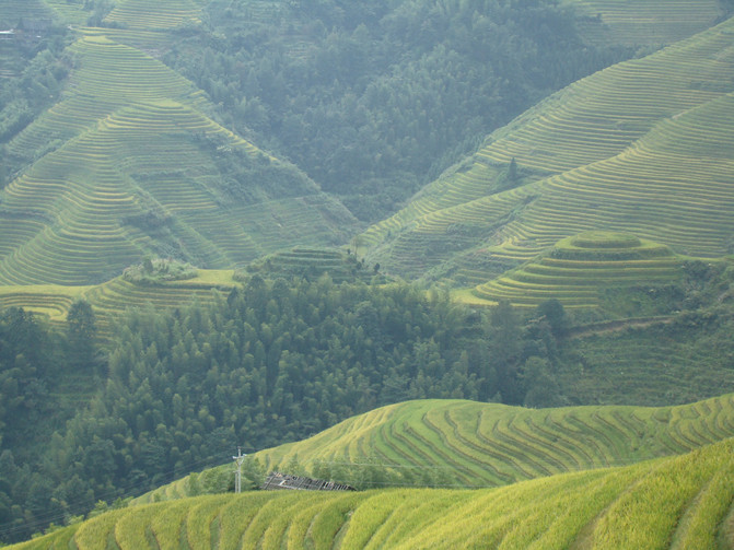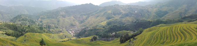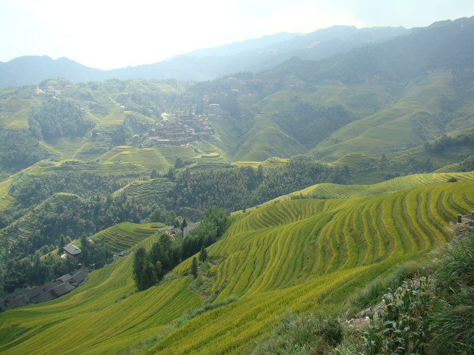 今天跟团去龙脊梯田(在客栈订的团),这趟旅行真是不怎么值。如果不是摄影爱好者,不建议去龙脊梯田。整个行程除了坐车(坐大巴到了停车场再换乘景区的中巴才能上山),就是到了山顶吃了一顿竹筒鸡(自费),拍了几张照片就结束了。如果是摄影爱好者的话,可以在那里住上两三天,多去几个寨子看看,可以拍到各种梯田。我们去的是金坑大寨,梯田很一般般。虽然劳累了一天,但是晚上洗完澡到天台上品茶还是不错的。