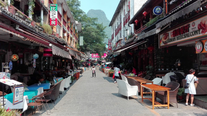 昨天骑行了一天累坏了,今天一直睡到九点多(这就是自由行的好处)。早饭午饭二合一,吃完饭直奔西街(阳朔最繁华的步行街)。西街的确不错,中西结合,既有中国特色的各式小吃,又有很西方风格的酒吧。除了吃的,还有许多具有少数民族特色的工艺品。西街的白天人很少,到了晚上简直是人头攒动,人挨人人挤人。整个西街的夜景是很好看的,美食也是很好的。