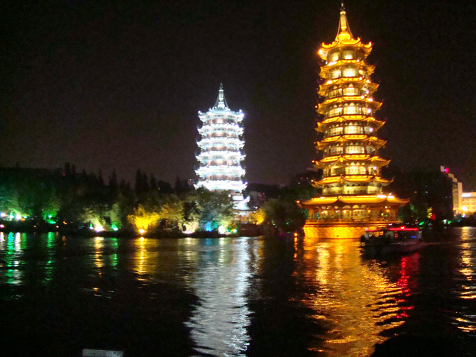 酒足饭饱后,开始坐船夜游“两江四湖”。其实这个项目值不了那么多钱,两江(漓江、桃花江)没有什么看头,到处黑乎乎的。到了四湖里面还是不错的,有很多用五颜六色的灯光装饰造型各异的桥梁,日月双塔在灯光的装饰下很漂亮。