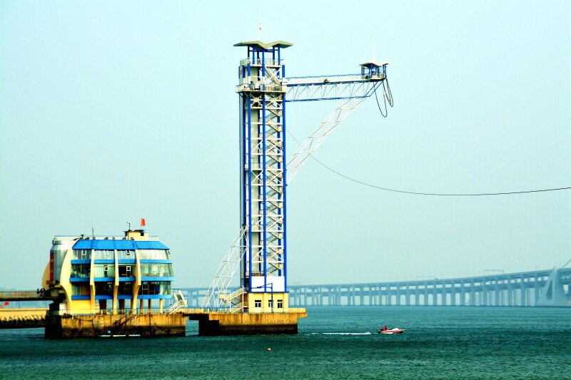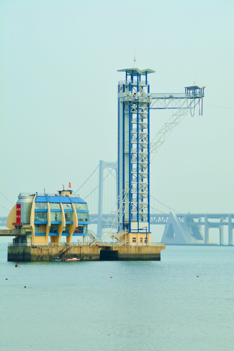 这是蹦极和溜索的高台,有蹦极也有溜索。玩蹦极的没有,玩溜索的小猫2个,可能便宜。但是也要80元一个人。大连星海公园是少有的可以玩海上蹦极的地方。大连星海公园的海上蹦极是自新西兰引进,据说是世界上最高的海上蹦极。跳台高55米,蹦极跳的支架上附设一座从美国引进的世界最高的液压观光电梯(39米),从电梯里可以欣赏蹦极跳的精彩过程。海面上空有一条长长的索道,据说是世界上跨度最长的跨海索道,长度为510米,从加拿大引进。不断有人在索道上滑过,吊在半空进行空中飞越,犹如武侠电影里飞来飞去的大侠一般。