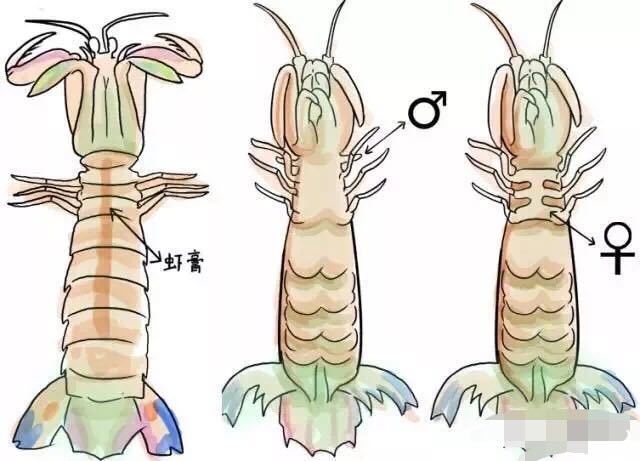 1、脖子上带白色“王”字的是母的;皮皮虾第三对足各有一只小腿为公。