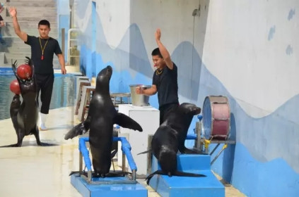 我国北方最大的海洋公园,也是近两年刚刚建成的,由海洋公园由小鲸迎宾池、圣蓝小镇商业街、中华国鱼馆、澳洲鸸鹋园、珊瑚岛、深海世界、海洋动物表演场、海龟池、海豹池、海盗城堡、3D·4D影院、少儿科普中心、美食中心、儿童游乐场、穿跃 马里 亚纳、疯狂嘉年华游乐场及休闲沙滩等三十余个分项目组成,是集旅游观赏、科普教育、互动娱乐、餐饮购物、休闲度假为一体的大型主题景区。最具特色和火爆的海豚、海狮表演,一般都是整点进行,最好提前去占座。