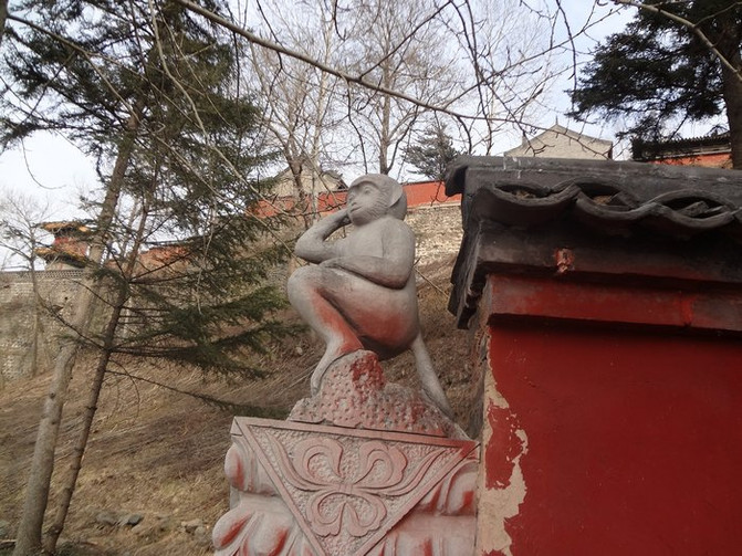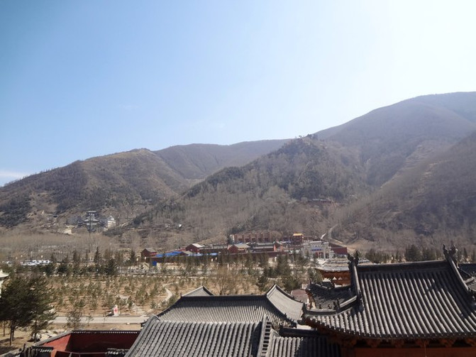 在罗睺寺门口,遥望很对面的山坡,山下是下善财洞,山腰处是上善财洞,山顶是黛螺顶。