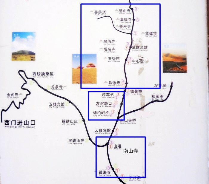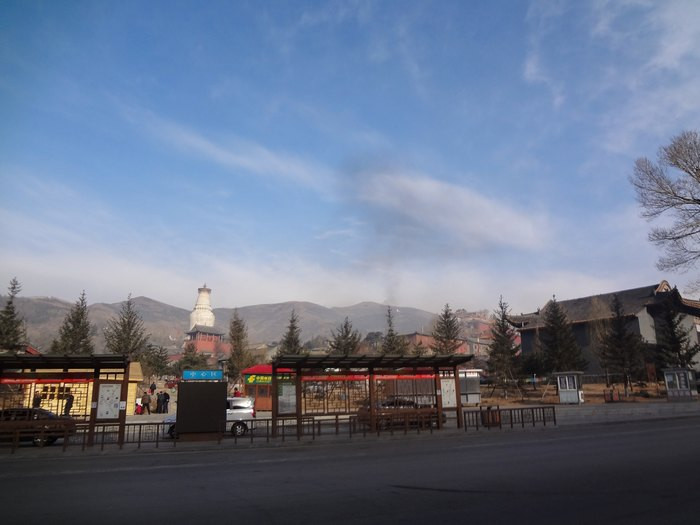 台怀镇的众多寺庙都分布在一条南北走向的山坳中,山坳中还有河流和公路。如果说台怀镇汽车站在当中的位置;那么大部分寺庙所在的“中心区”,就在汽车站以北2站路;南山寺和镇海寺在汽车站以南3站路附近。