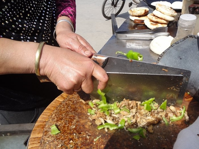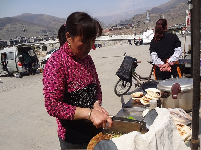 五台山,黛螺顶下的广场,肉夹馍。要了个素的肉夹馍,台蘑+青椒。