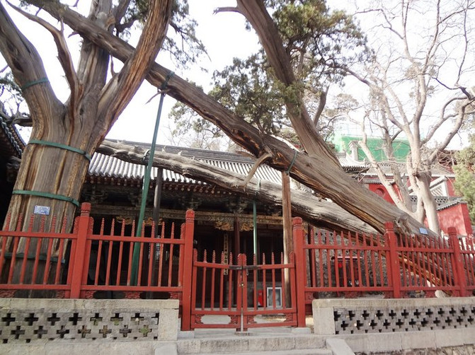 大殿边上的老柏树,横着的是周代的柏树,2000多年,竖着的是唐的柏树,1000多年。