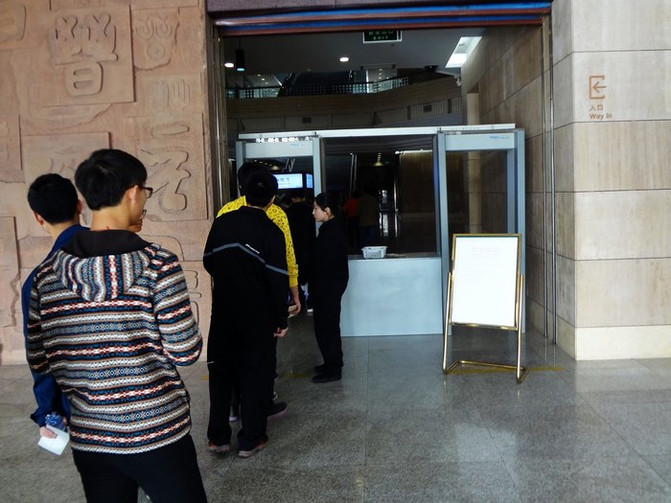 博物院有东、西两个门可以进入院中,但进入主展馆,必须从展馆的东入口进入。进入主展馆的大门,左侧是寄包的地方,寄存的包需要安检。