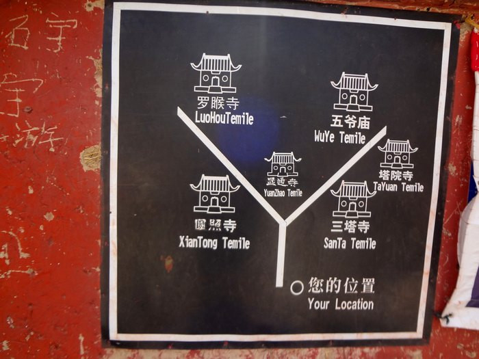 五爷庙-塔院寺-显通寺-罗睺寺-黛螺顶-菩萨顶-殊像寺-镇海寺-南山寺,途中经过了广宗寺和圆照寺,一共11个寺庙~