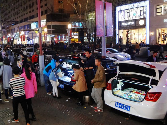 柳巷的管理还是比较开放的,人行道上可以摆摊。商贩用私家车的后备箱作为橱窗。