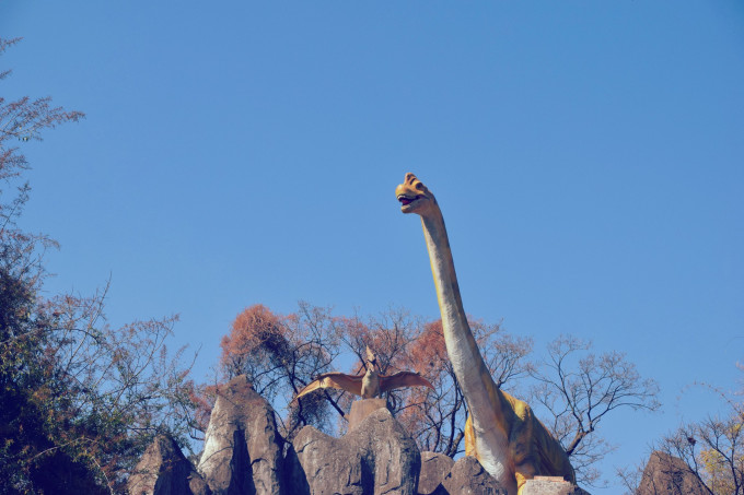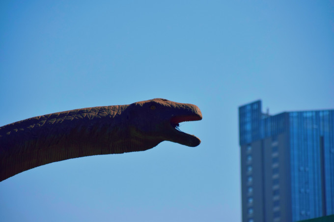 猴山之侧是恐龙谷,当然是假的啦,不过仿真度很高,不但会动还会怪叫,与远处的城市高楼隔空相望,简直魔幻感十足。