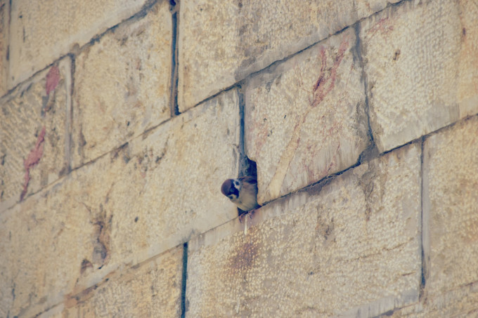 唐墓冢十分巨大,四围以坚石环砌,石缝中留有排水孔,麻雀们好像喜欢探险的孩子,常常往孔里头钻。这只小麻雀正好探出脑袋和我对望,样子很呆萌。