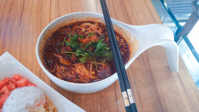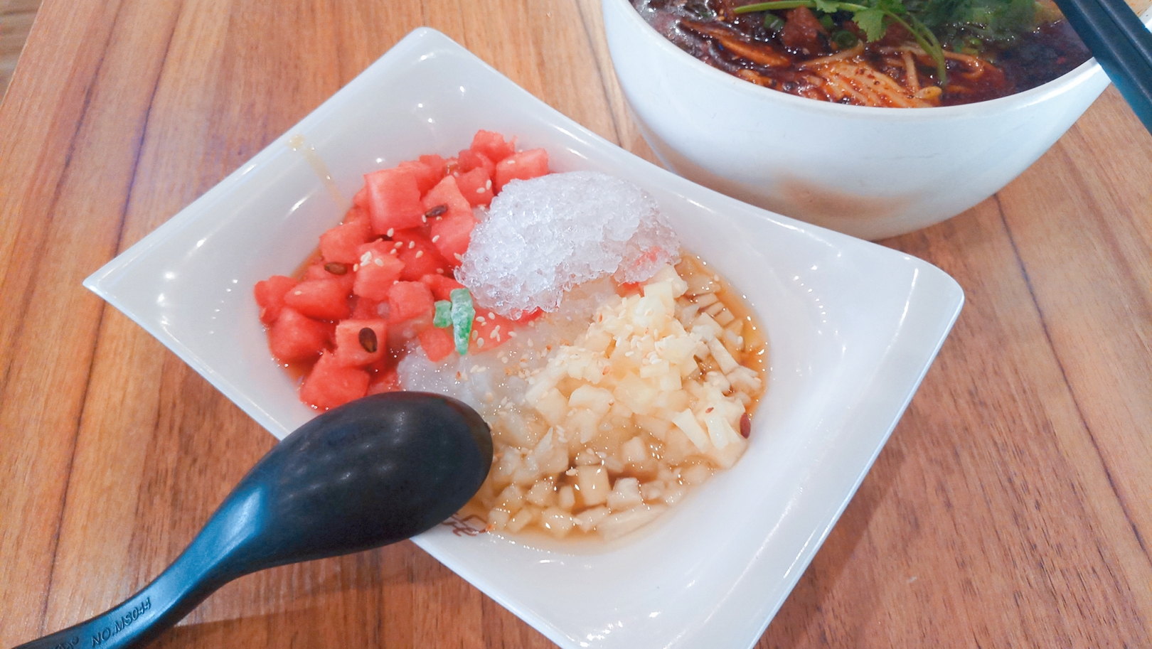 到了文化巷,随便找了一家餐馆,也不知点什么,点餐的服务员推荐了招牌小辣面和招牌冰稀饭,既然是招牌菜应该不会差。结果辣面辣得我耳鸣眼胀,喉如吞炭。吃到最后都不清楚滴下来的是汗水、泪水、抑或是鼻涕口水了。不过冰稀饭很爽,超解辣。(难怪小妹要推荐这一组合)