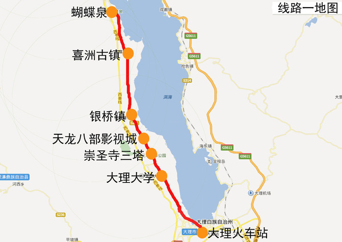 这条路线主要是游览大理的一些经典景点。早晨可以先逛逛人群还未拥挤起来的古城,然后到崇圣寺三塔转转,参观三塔大概2小时。接着前往天龙八部影视城,此处是金庸迷必到的景点哟。午饭可以在影视城下面的214国道周边的找一家顺眼的饭店解决。这里多为白族特色餐馆,如果怕不合胃口也可以到喜洲古镇再吃,古镇内的小吃非常多。大概下午5点左右返回大理古城欣赏下夜景就可以结束一天行程啦。