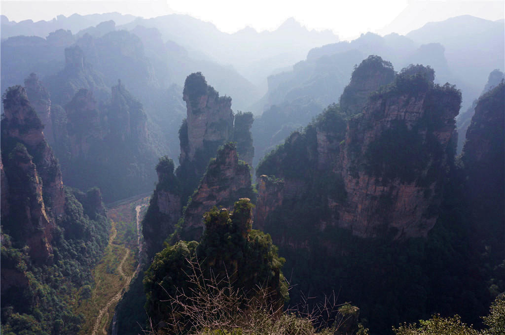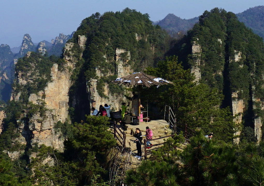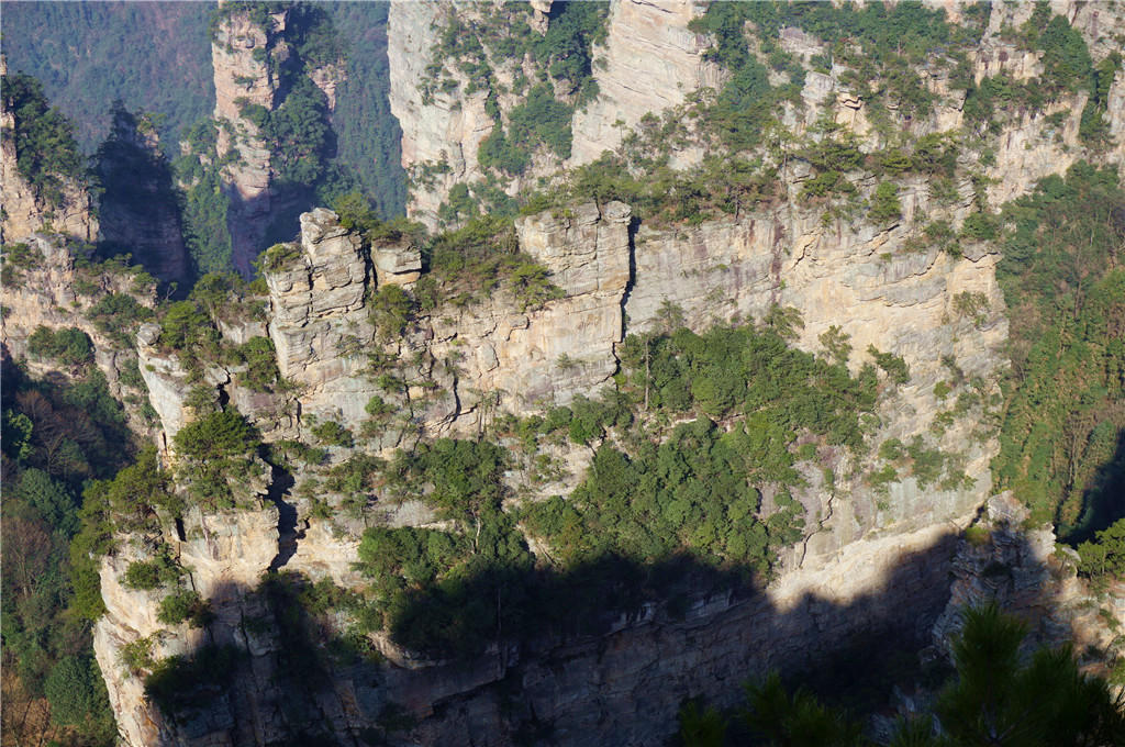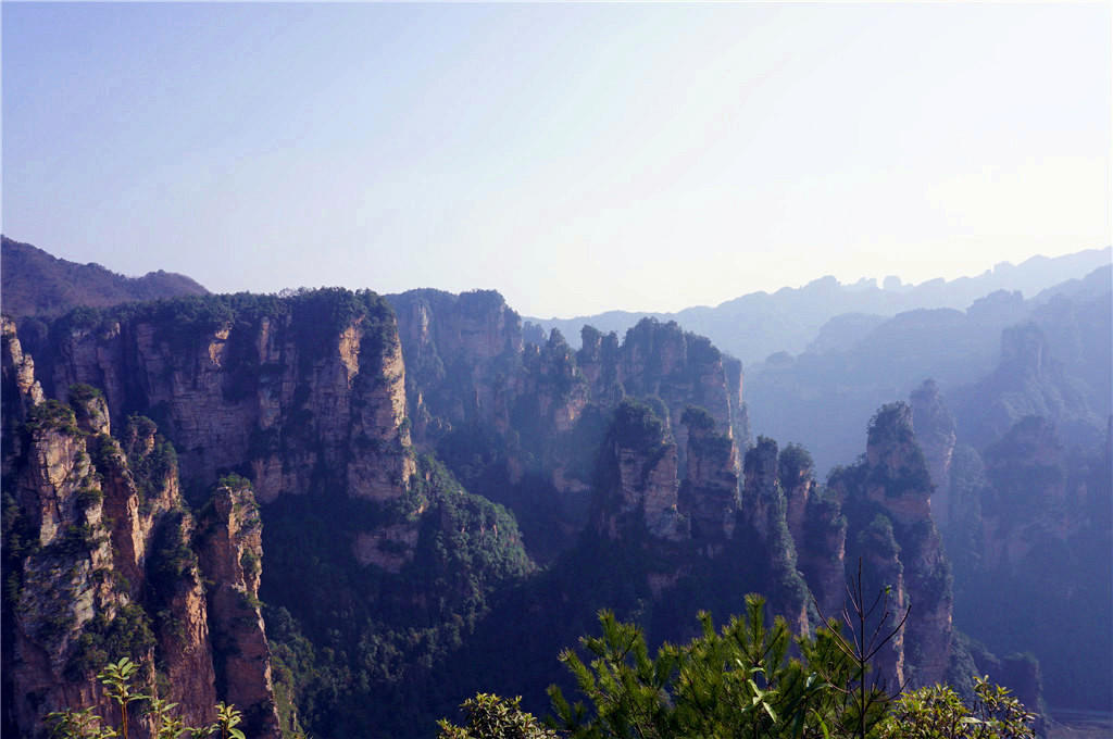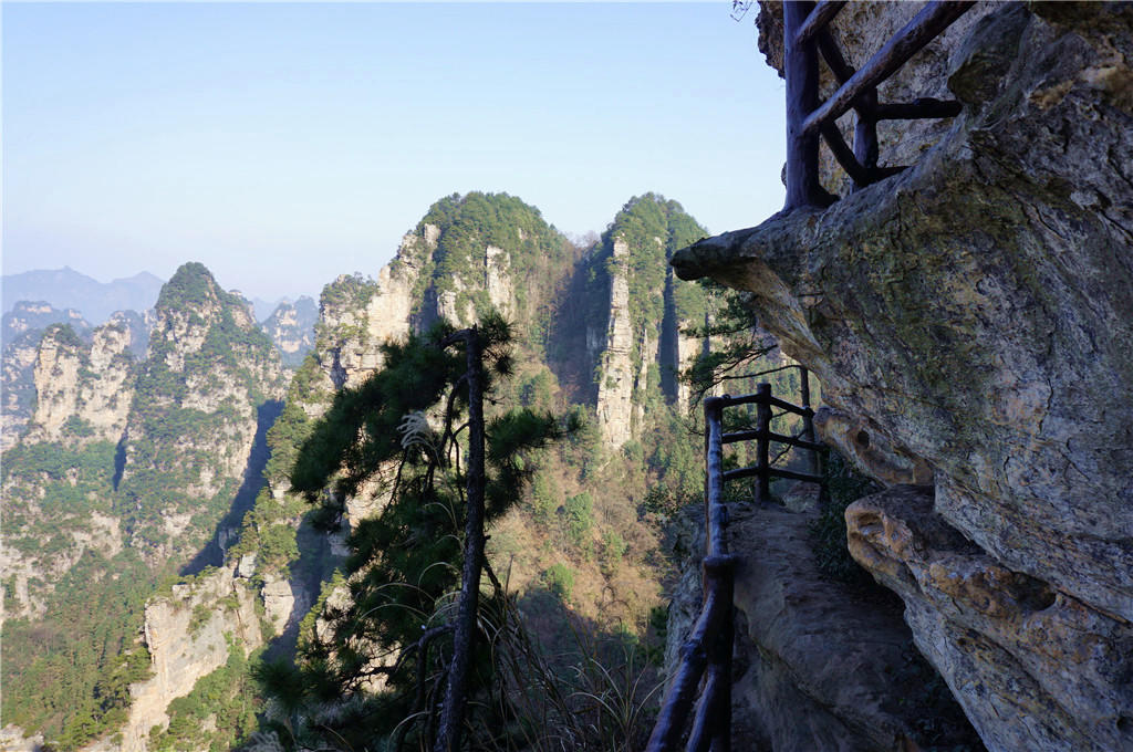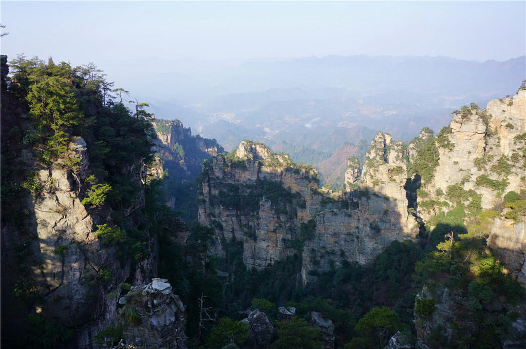 离开寨子进入观景正题,时间已是九点多,阳光并没有影响到拍照,袁家界是 武陵源 景区的核心所在,特别经过 美国 科幻电影《阿凡达》拍摄取样之后更是名声远扬,它最独具特色的地方就是那一整片岩顶平台,以及由高耸、分割林立的砂岩 石柱 群所汇成的峰丛,游人至此只见山移峰浅,常不知身在何处,故有“迷魂台”之美誉