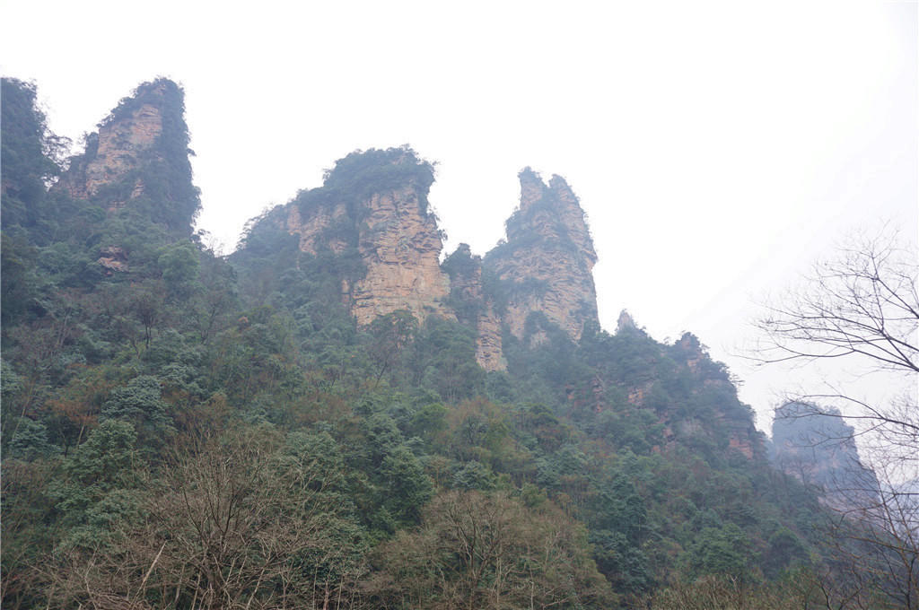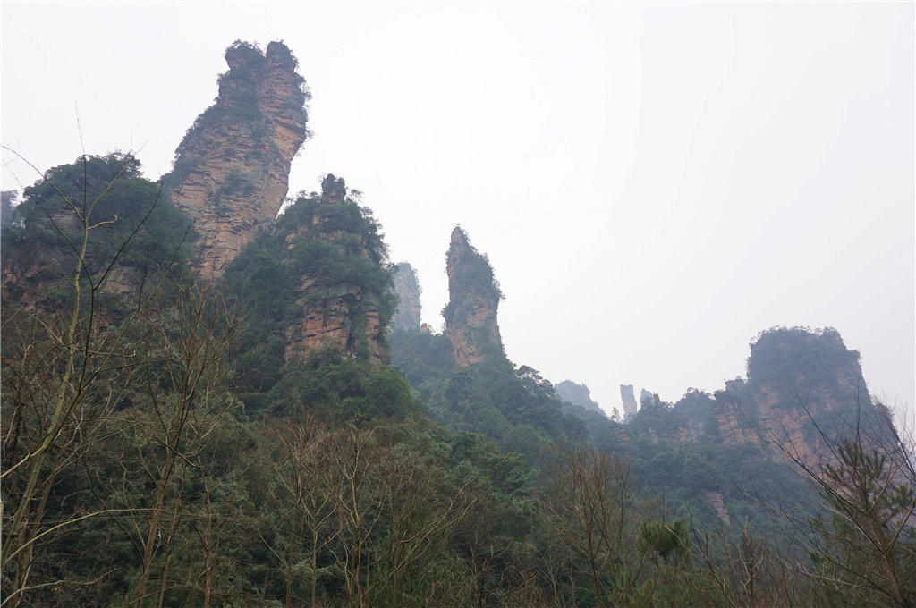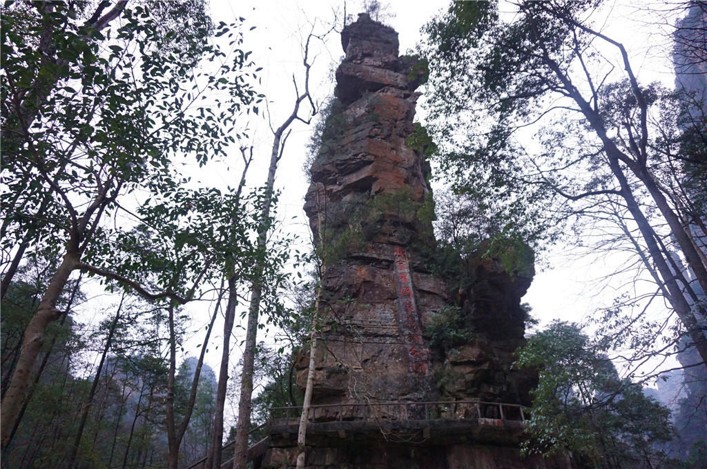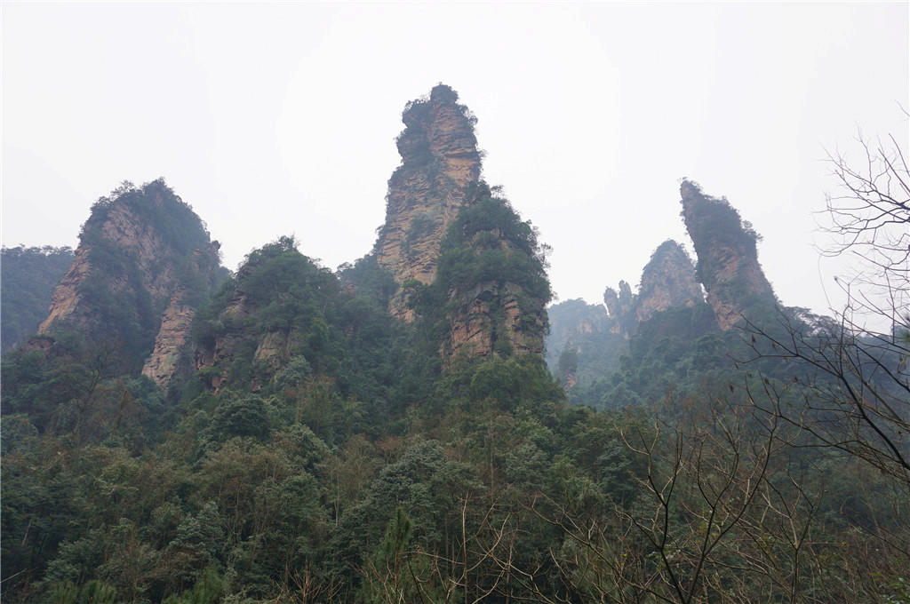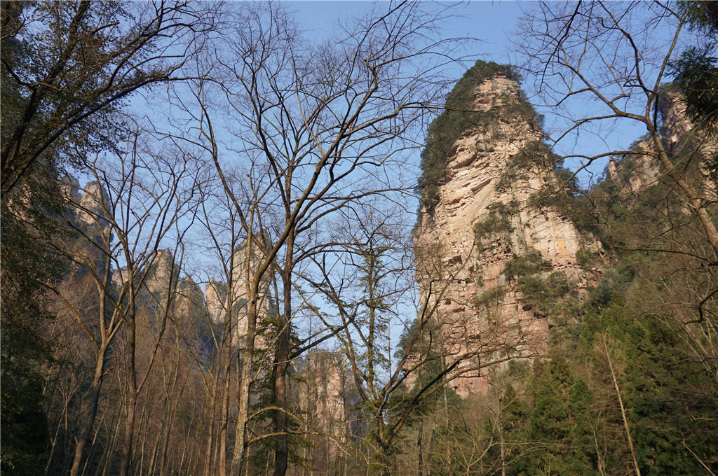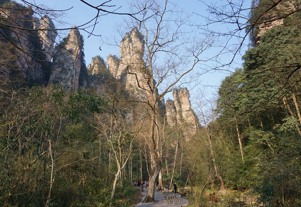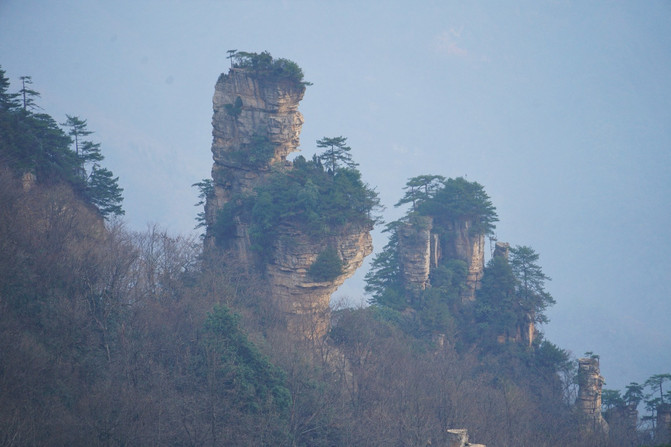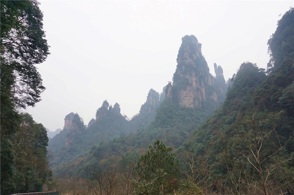 从著名元帅的铜像向下走,就是著名的天子观景台,因为我来的季节是冬季,来这里的人并不是很多,站在这里举目眺望,天子山景区的三千奇峰尽收眼底,五指山、石峰林、石船出海、御笔峰等都能看到,雄奇壮观、似人似兽、若剑若戟、神态各异,不禁让人连声称奇。