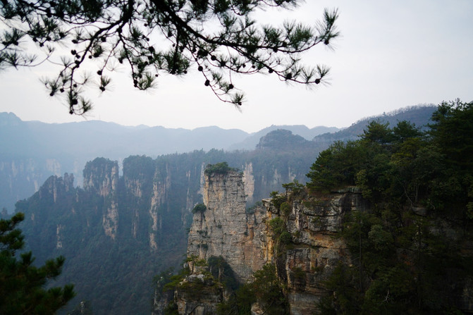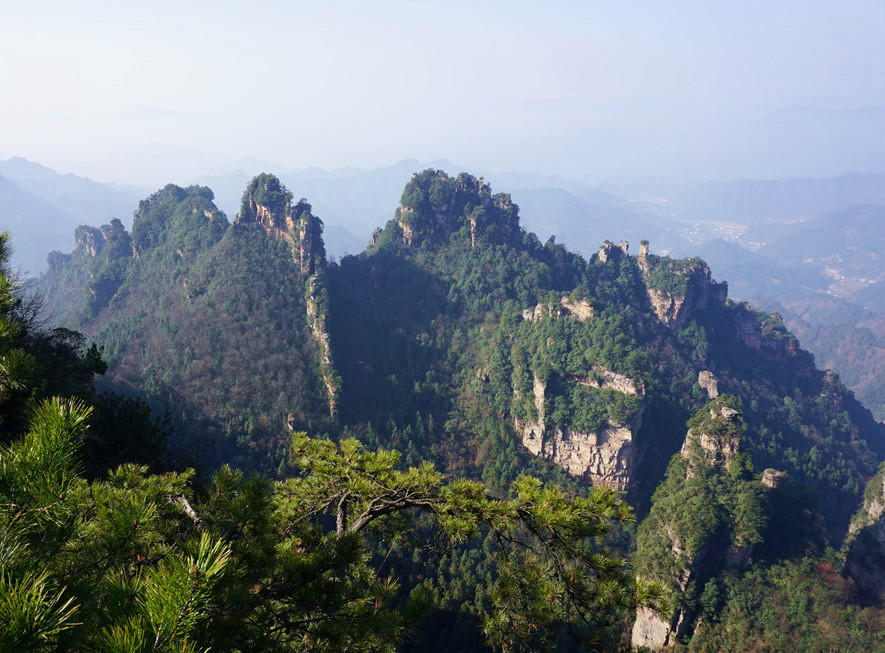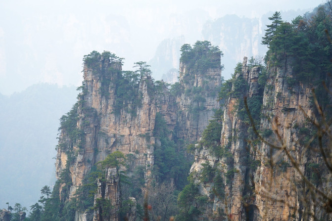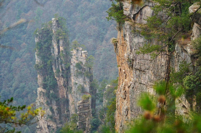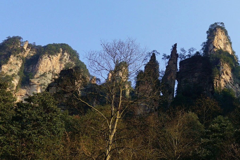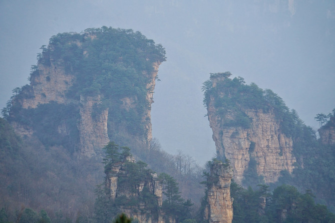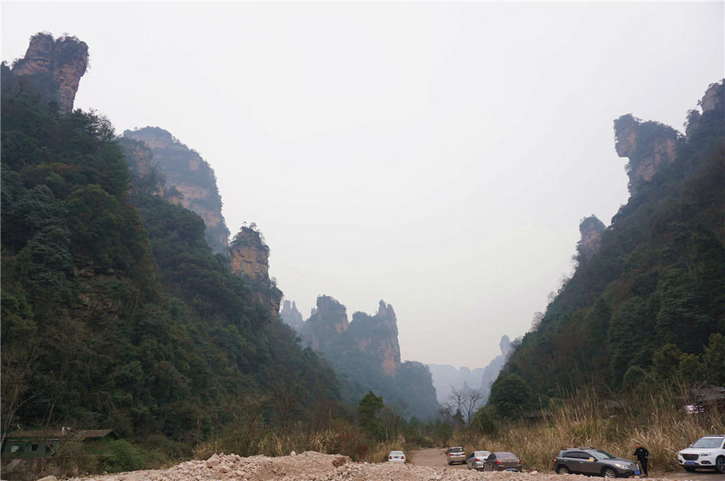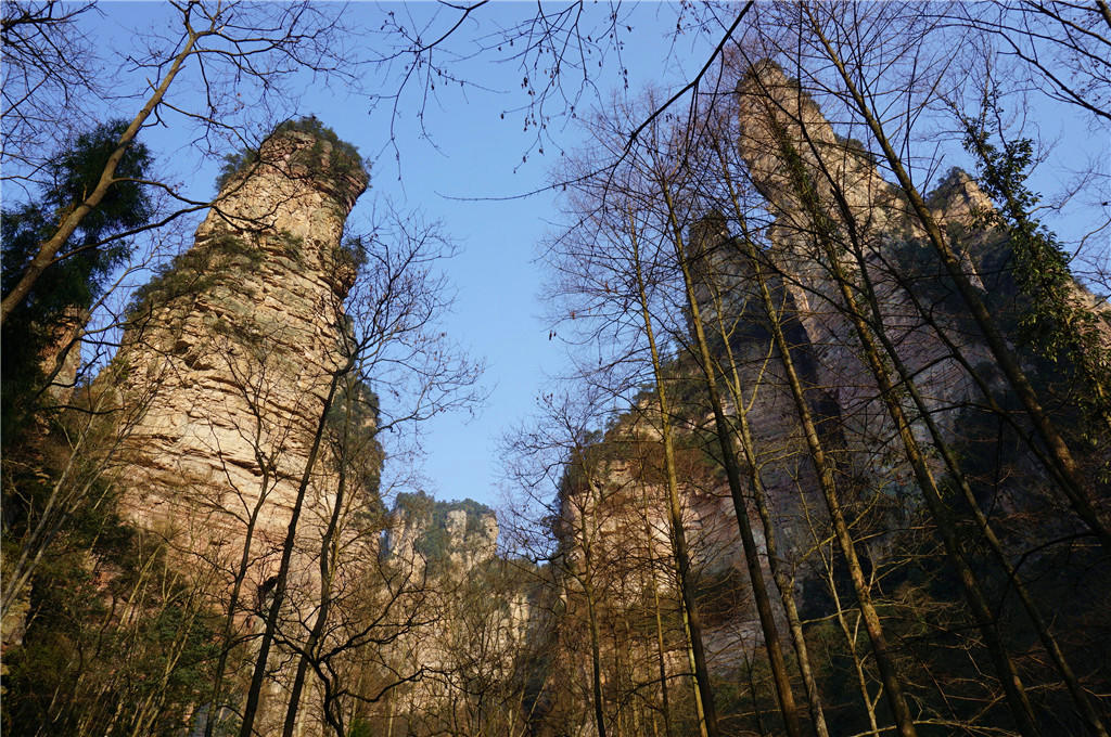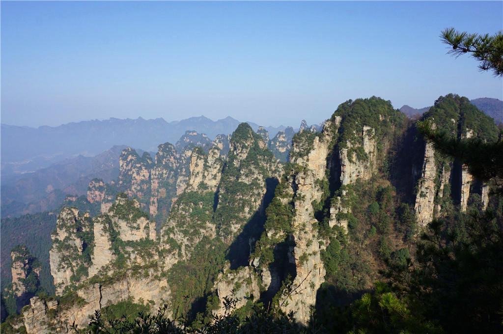 从著名元帅的铜像向下走,就是著名的天子观景台,因为我来的季节是冬季,来这里的人并不是很多,站在这里举目眺望,天子山景区的三千奇峰尽收眼底,五指山、石峰林、石船出海、御笔峰等都能看到,雄奇壮观、似人似兽、若剑若戟、神态各异,不禁让人连声称奇。