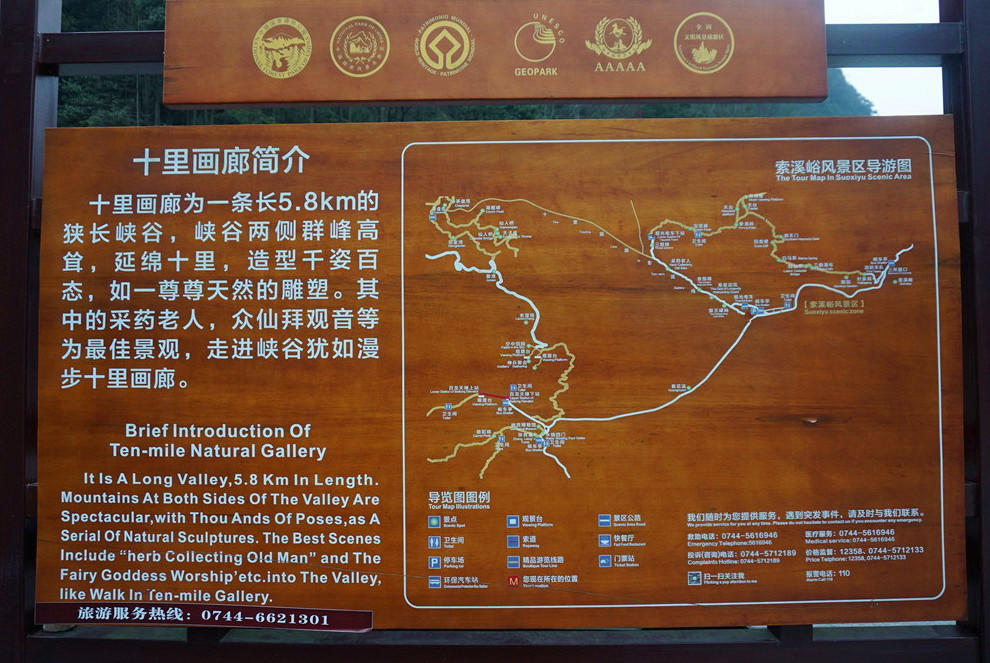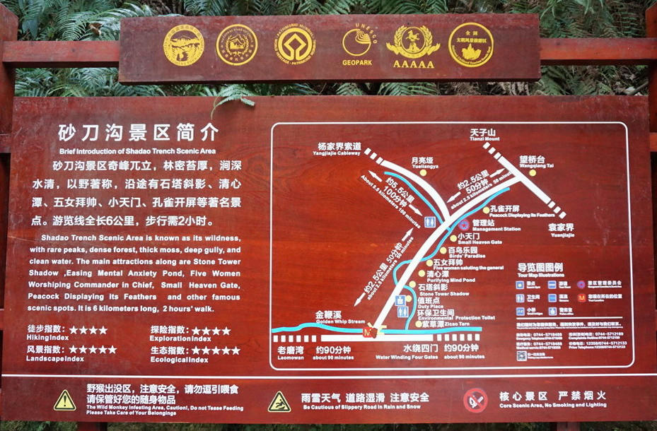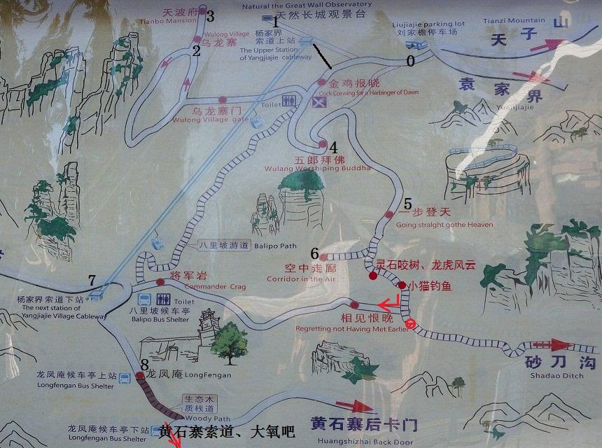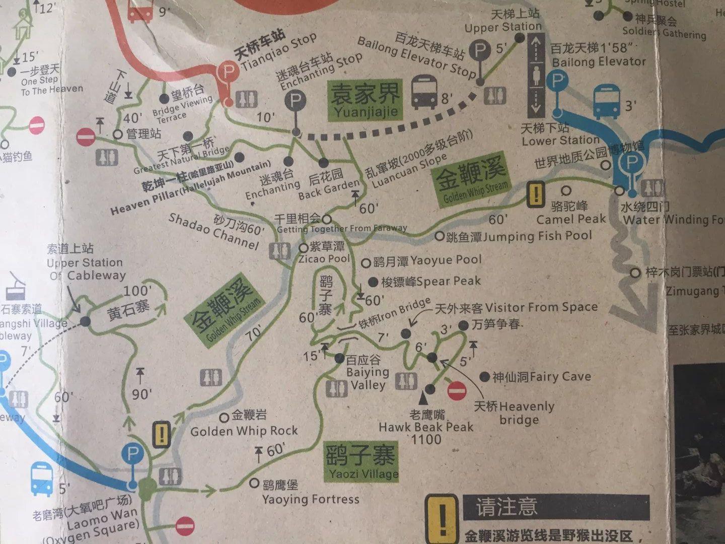 新版杨家界景区游览图,空中走廊旁边可以直接下山去杨家界索道下站。当然去砂刀沟那条路就不要走了,基本荒废了。
