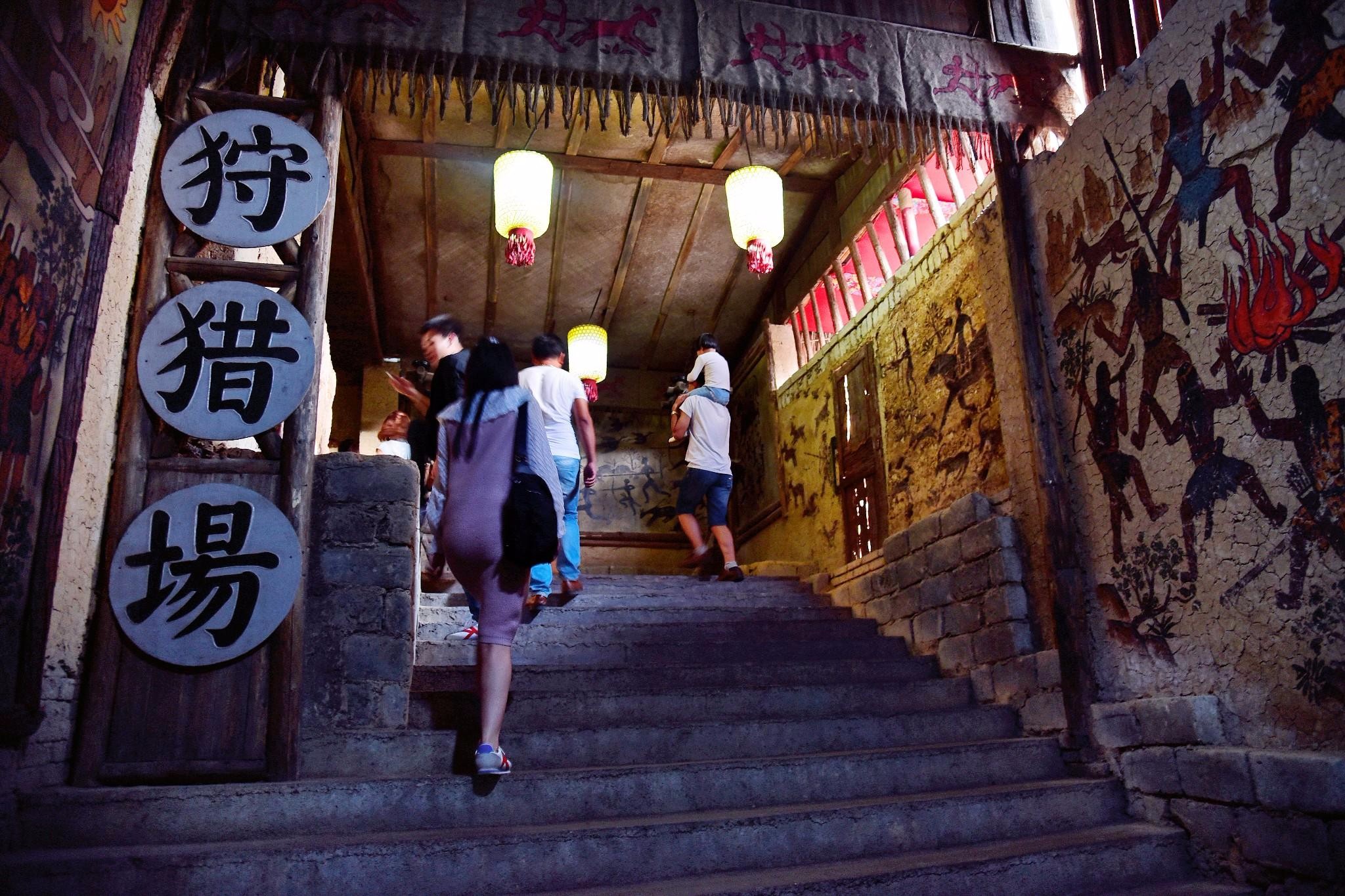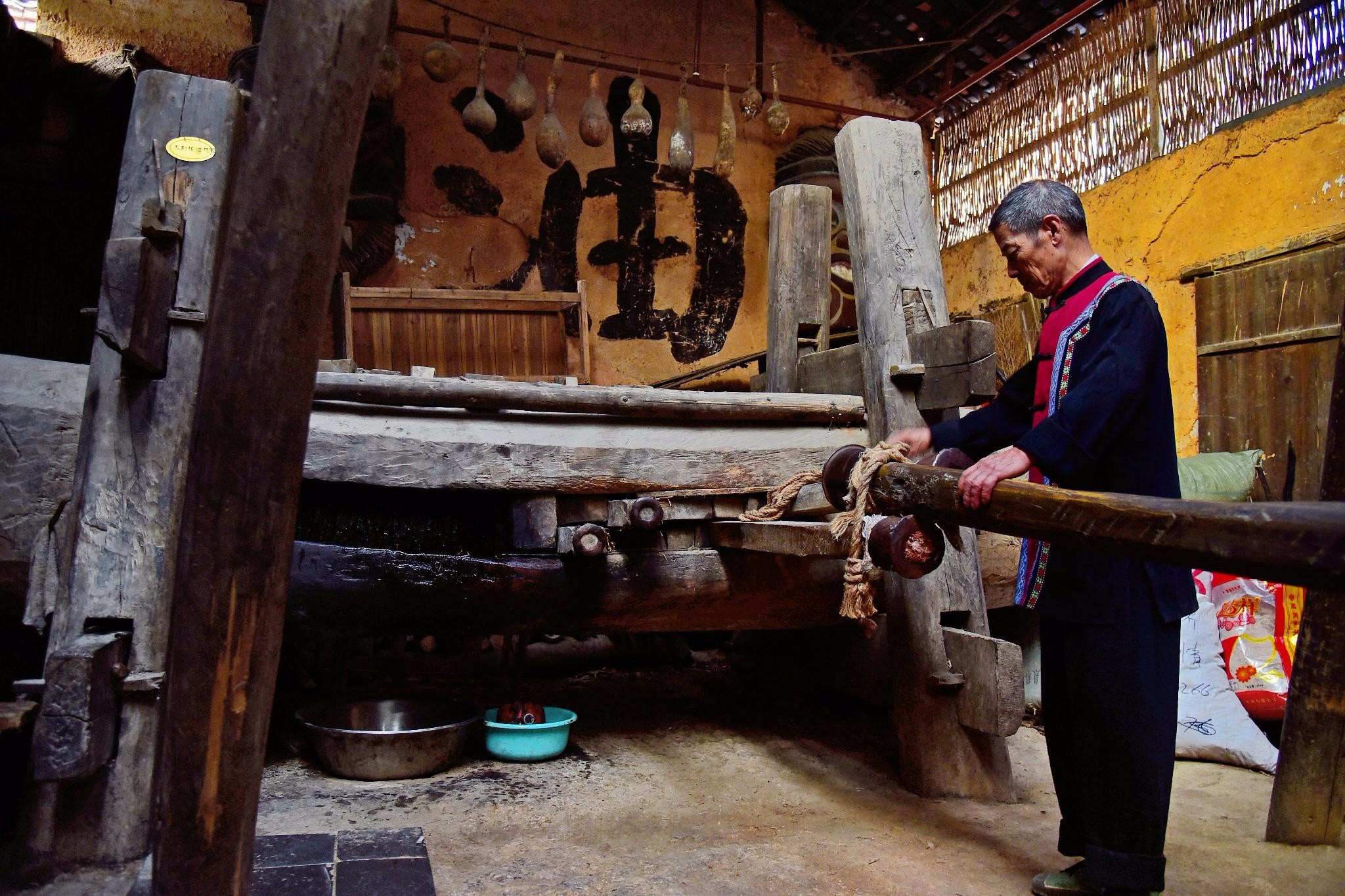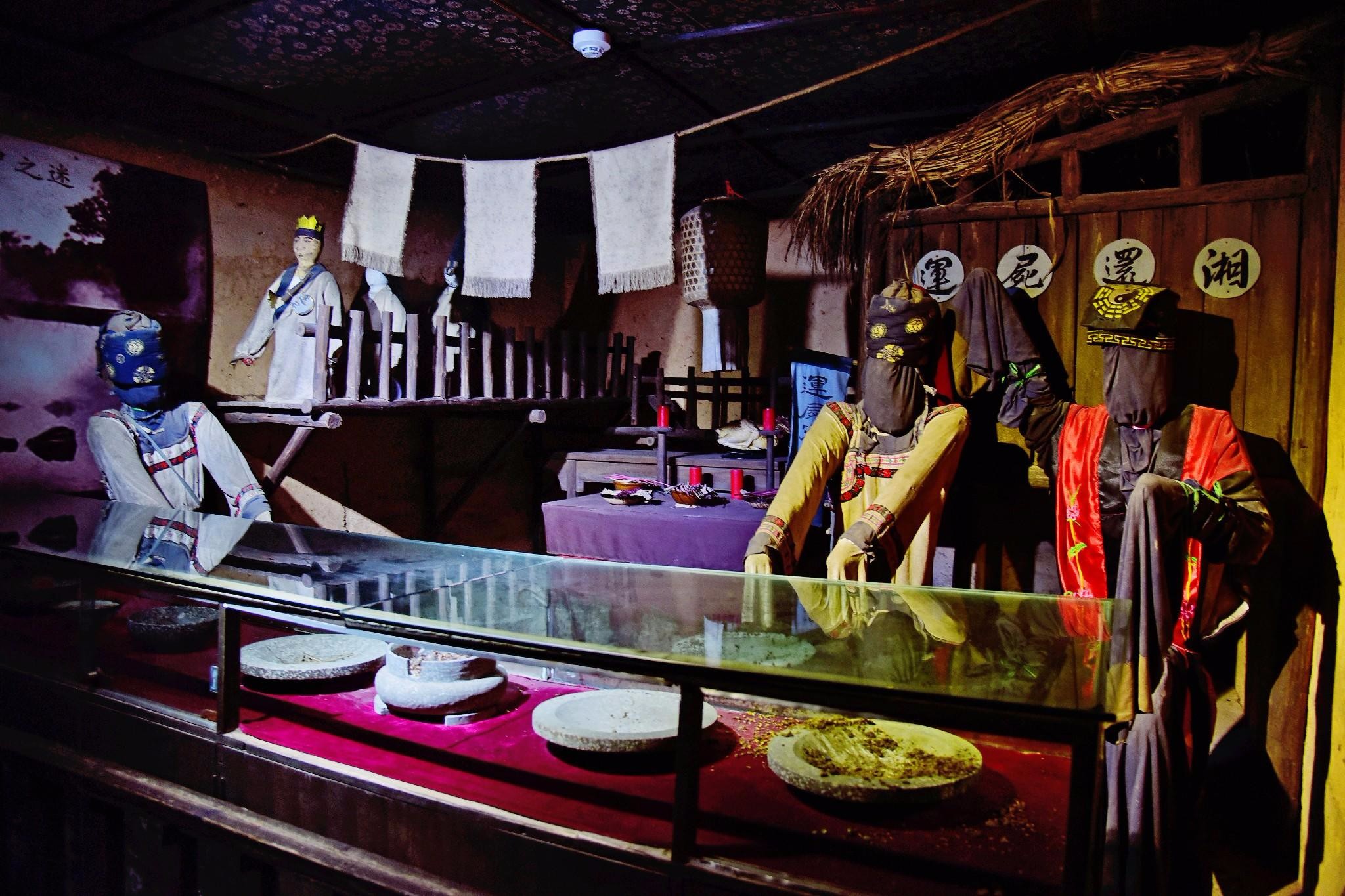 接下来又是一段土家人风俗文化的展示区,不过比起一开始的区域要明亮畅快多了,主要展示了土家族的木雕、织绣艺术、以及最原始的磨米、榨油、酿酒技术,有兴趣的还可以亲身体验一把