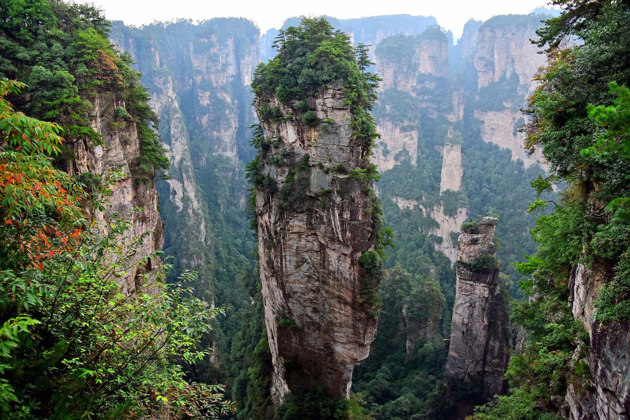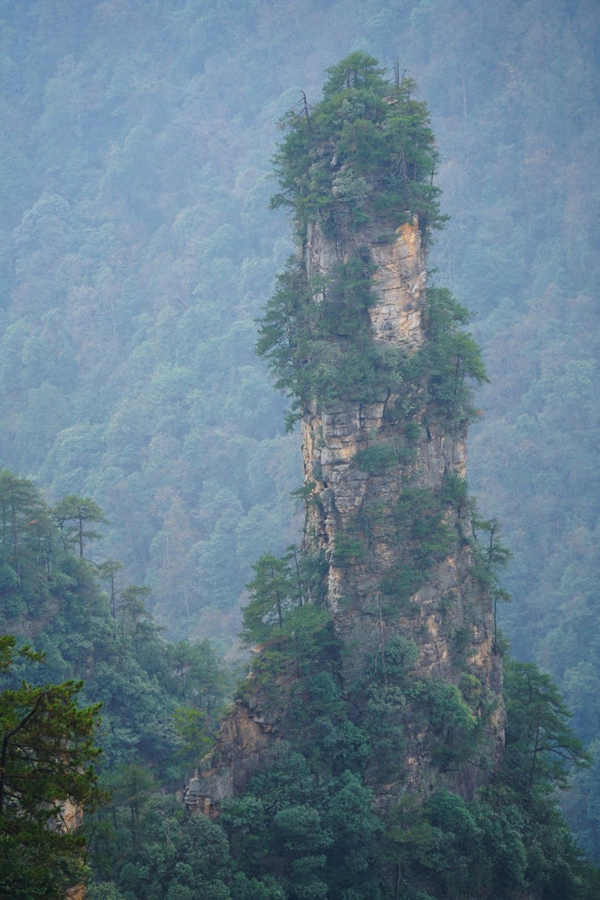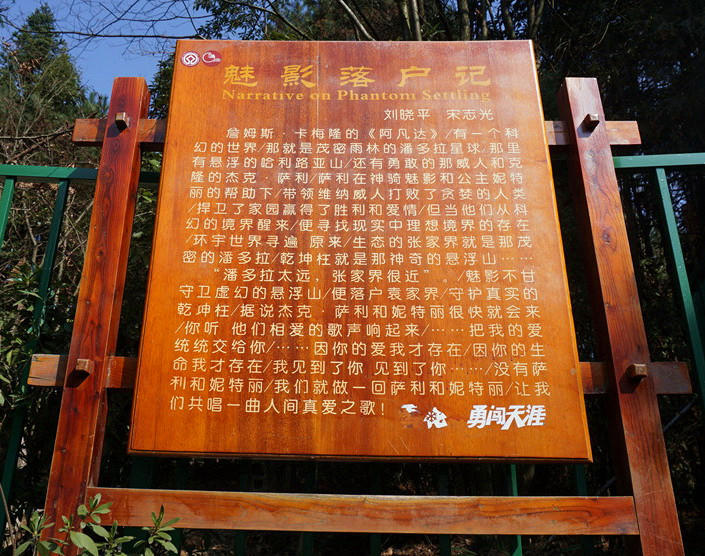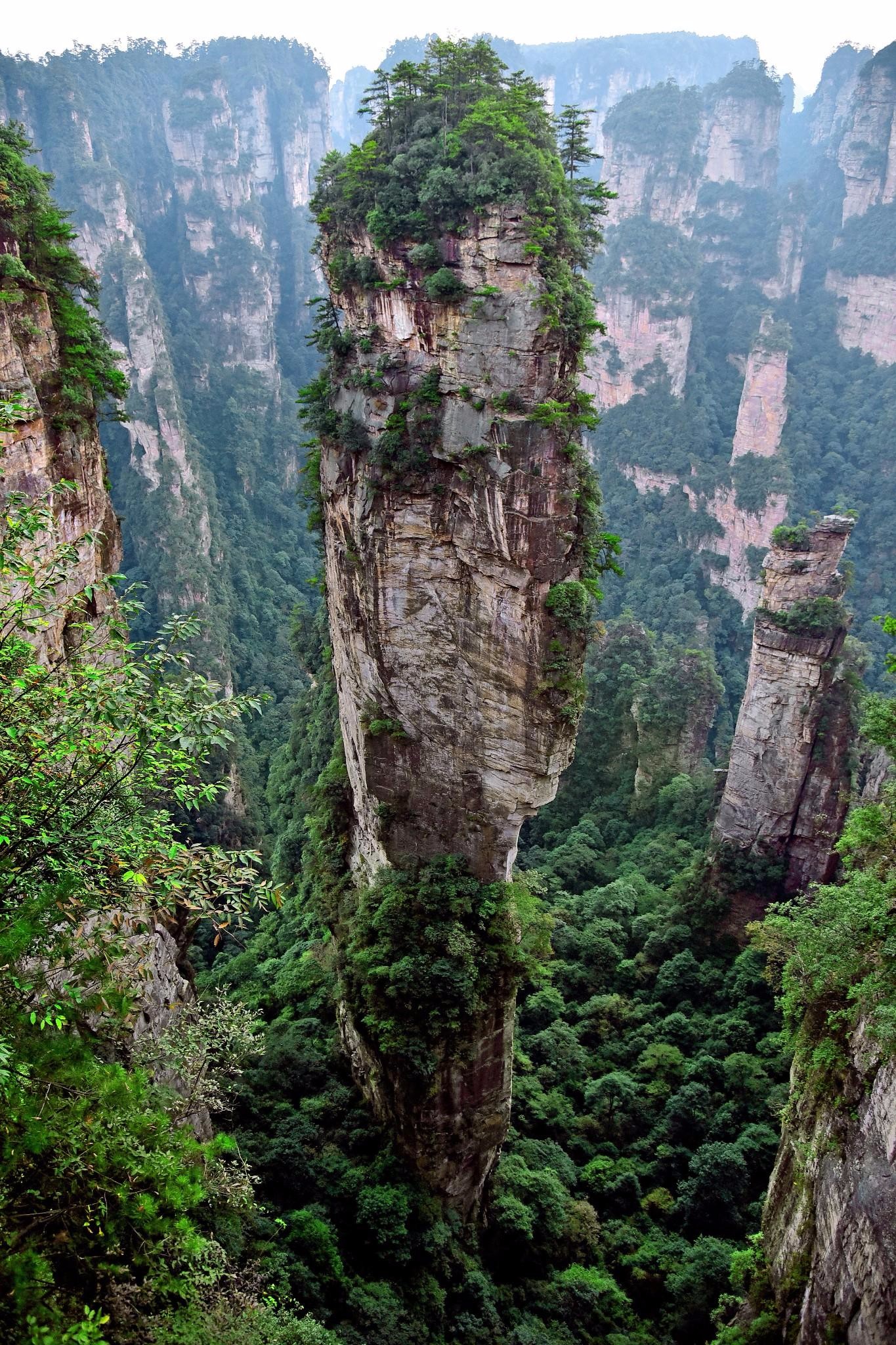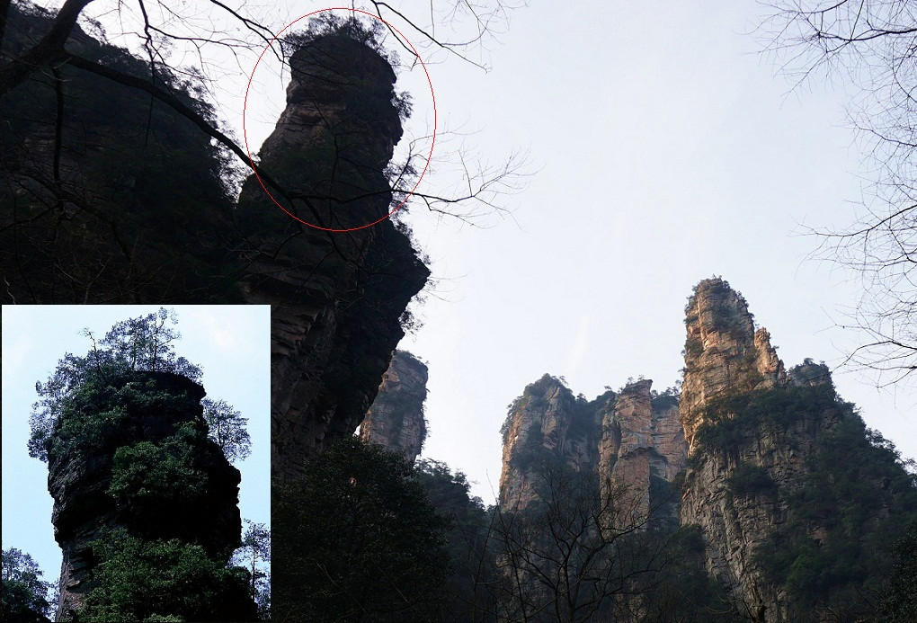 峰丛中有一座垂直高度约150米的“南天一柱”格外引人注目,它的顶部植被郁郁葱葱,峰体造型奇特,垂直节理切割明显,仿若刀劈斧削般巍巍屹立于袁家界,有顶天立地之势,故又被称为“乾坤柱”,这也即是《阿凡达》潘多拉星球中 大名 鼎鼎的悬 浮山 原型了 祖国大好风景走向世界本是好事一件,然而 张家界 景区管委会居然借势在2010年将好端端的乾坤柱改名成为“哈利路亚山”,对此我不仅鄙视甚至气愤,理由自不必多说,真是又土鳖又媚外(还是忍不住说了)。。