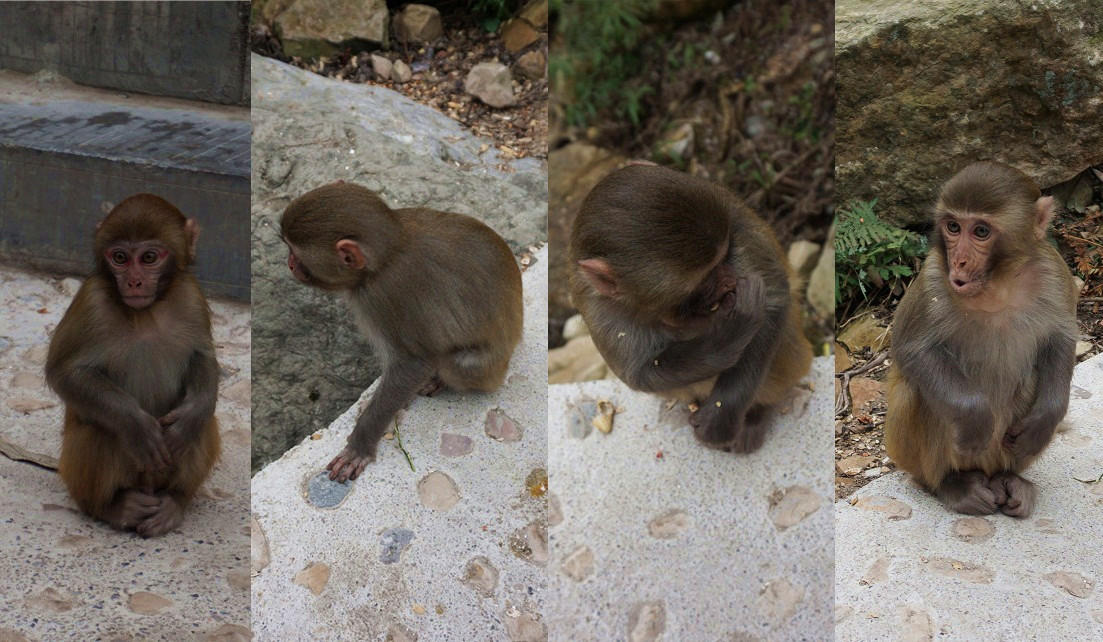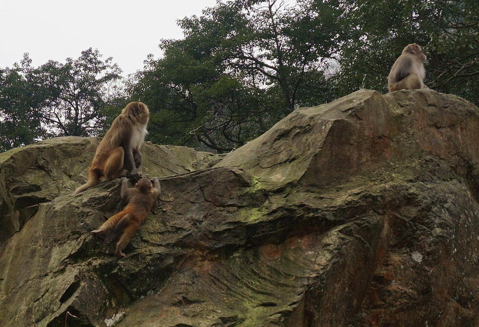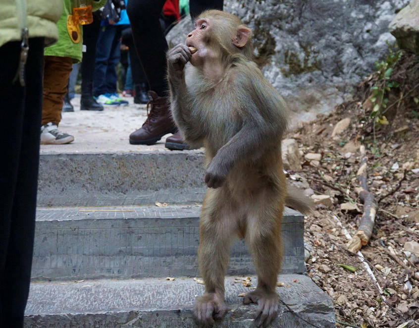 不久见到一群猴哥猴姐在石凳上休息,并不怕人——它们才是这里的主人呢。经管有禁止喂食的告示,但游人们还是纷纷乐此不疲的投喂。