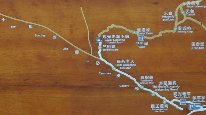 从百丈绝壁沿路一直走十来分钟就到停车场,根据自己的行程不同的 通道 排队坐环保车,车满即走,不需要等很久