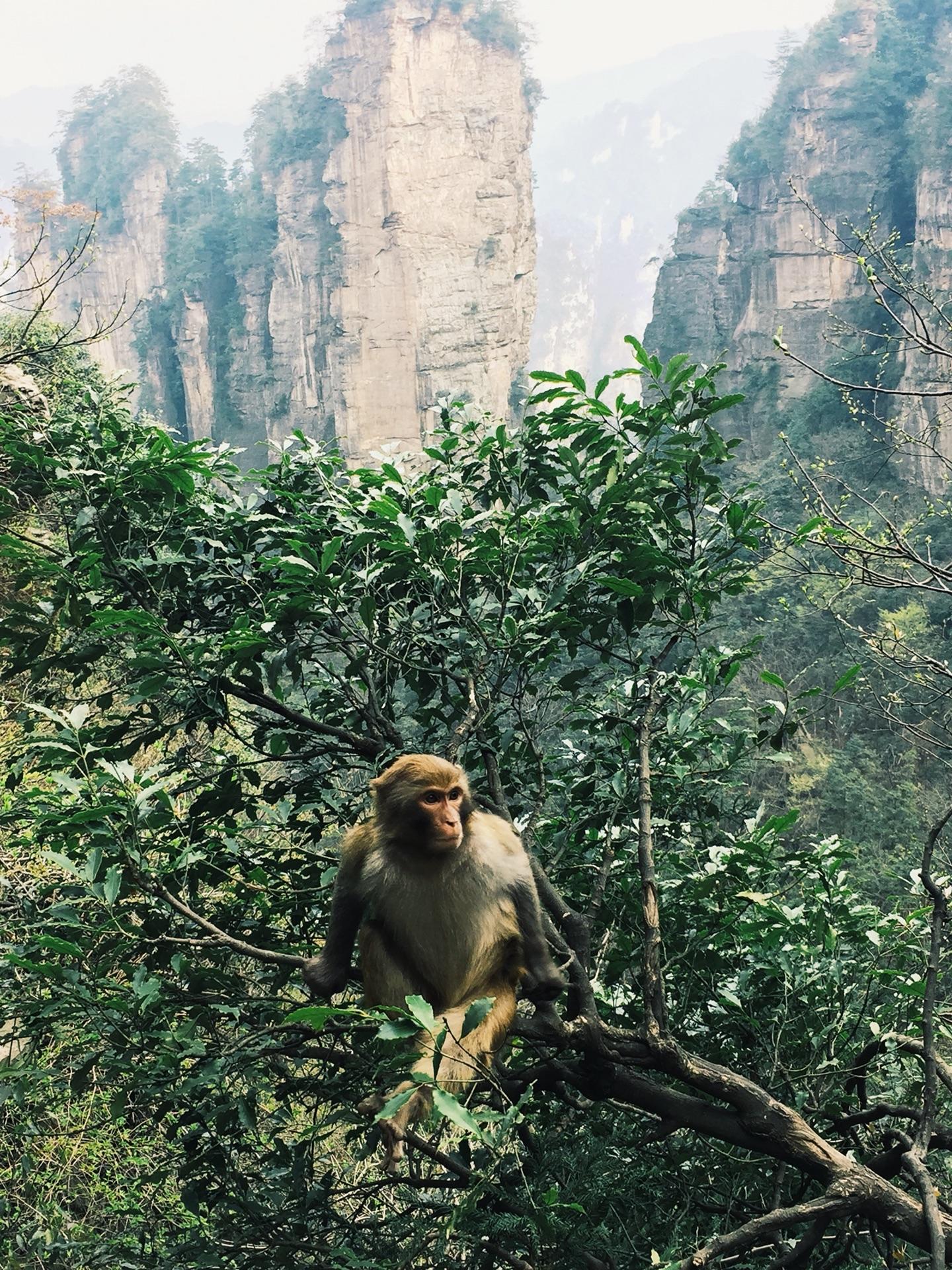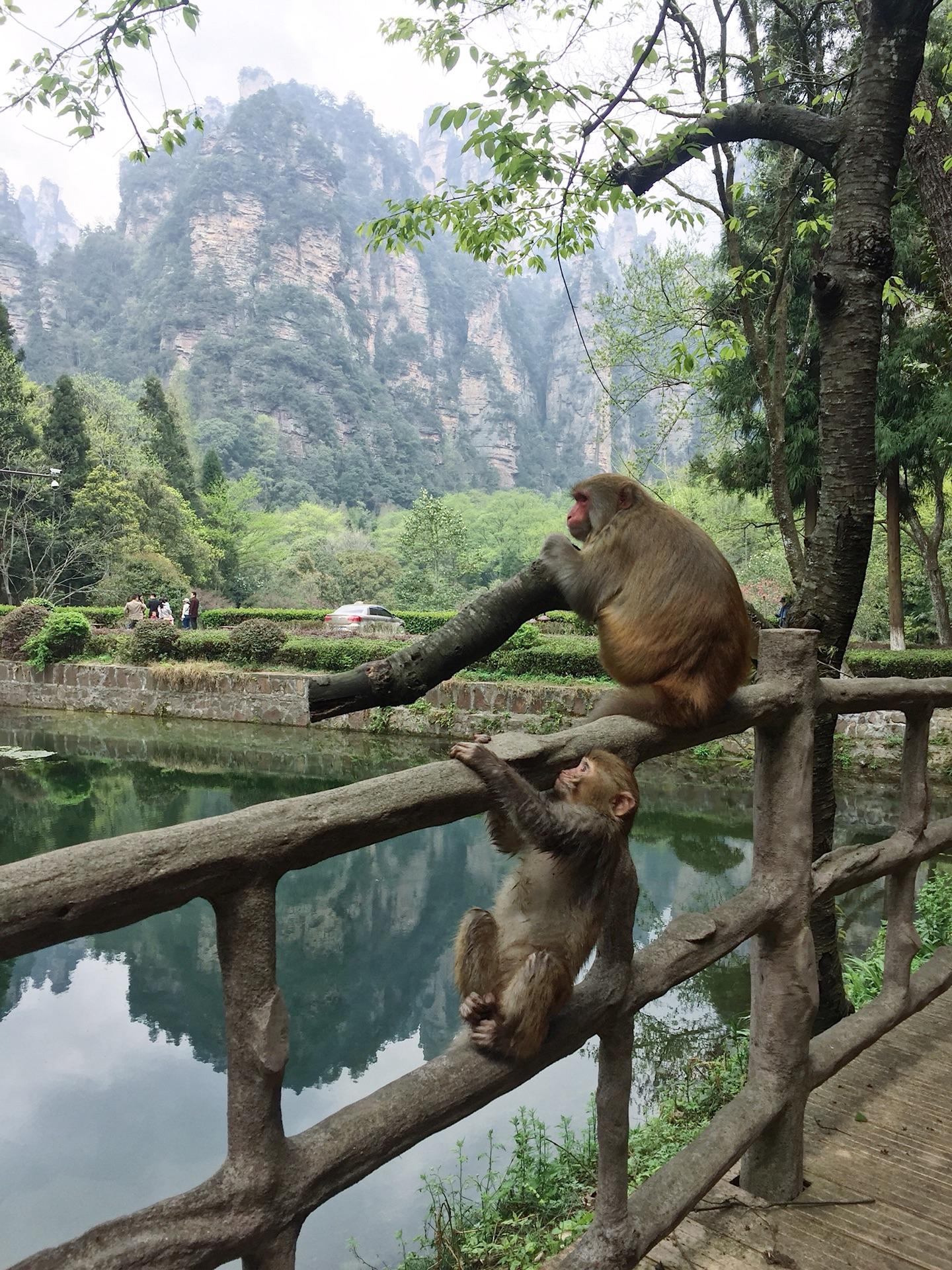 循着叮叮咚咚的溪水声,闲散的漫步在金鞭溪畔,一泓碧水,几许微风,满眼绿意,都让我感到心旷神怡,山峦叠嶂,峡谷幽长,三三两两的猴子是金鞭溪独特的风景,他们似乎已经习惯了人们的经过,自顾自的嬉戏着。