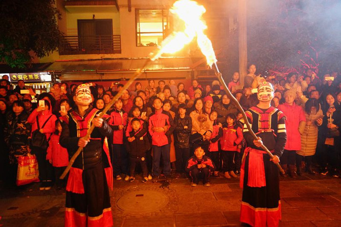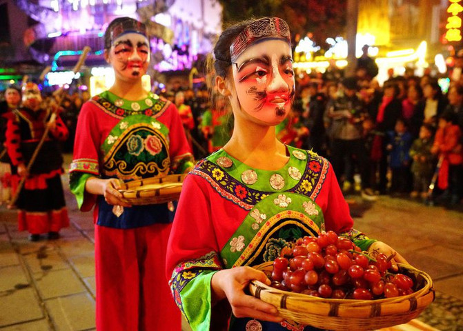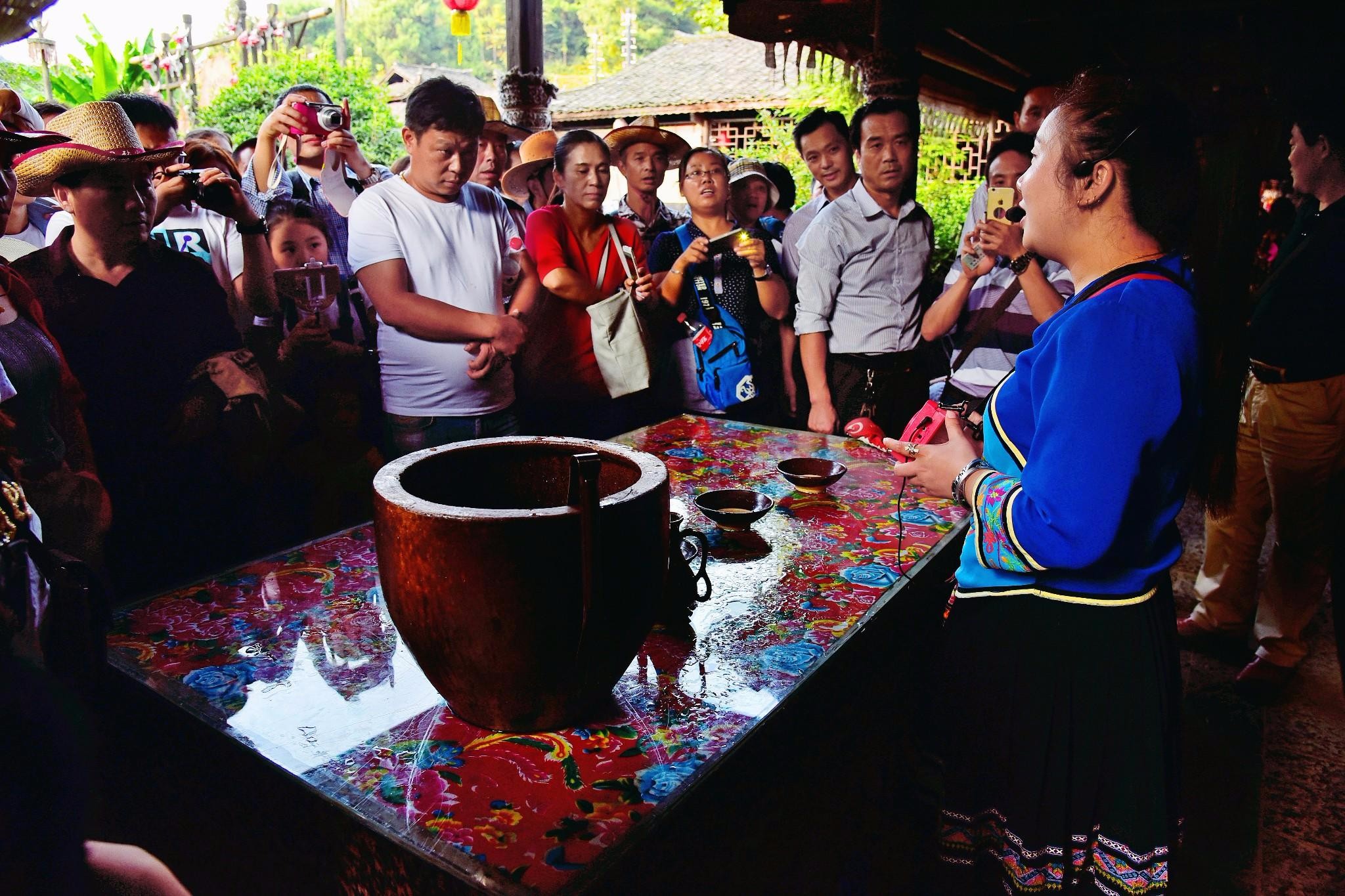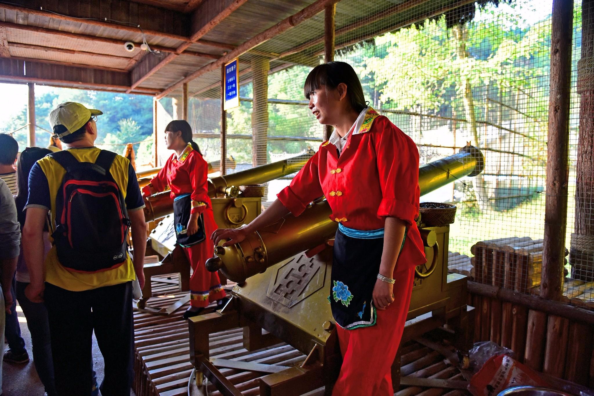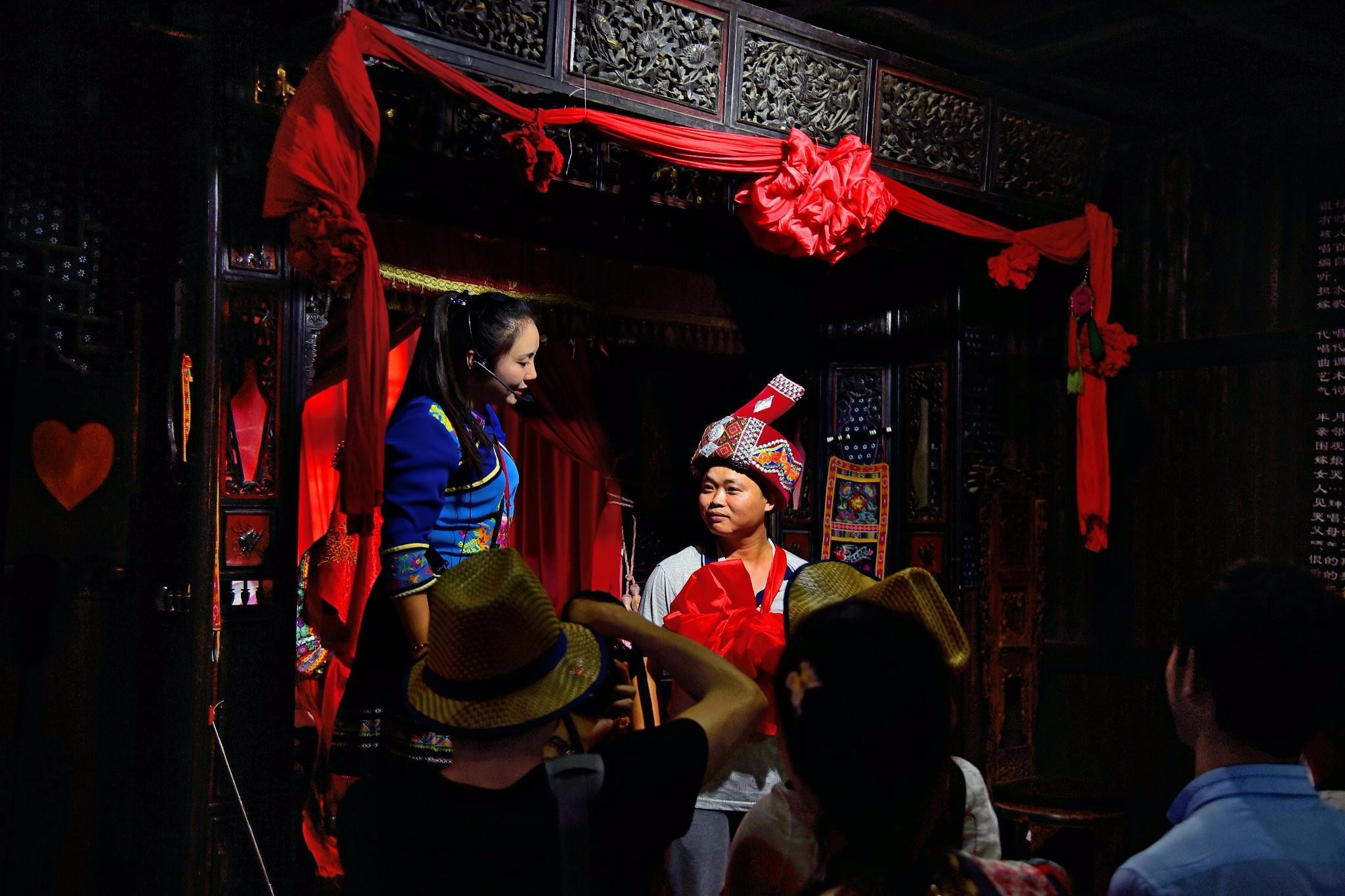 最后我们随人群进去一间挂着红帐的堂屋之中,观看号称土家族“千古绝唱”的哭嫁表演,以为男游客被邀请上前戴上大红花扮演新郎,在红娘兼讲解员的领导下,要对掩脸大哭的新娘展开蜜语甜言的攻势,直至将新娘盖头掀起,让大家一睹新娘娇美面容为止,在大喜日子里看新娘各种哭嚎,如此独特的风俗让人印象深刻,表演过程中还有一大亮点便是在一旁扮演红娘的土家姑娘,十分搞笑的言语把全场气氛搞得火热