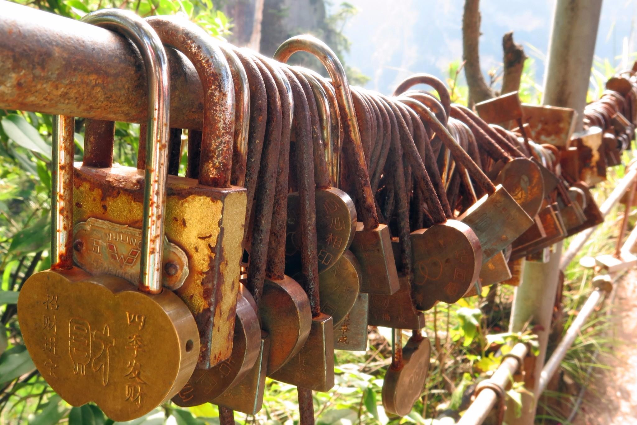 过桥之后就是锁山堂。几乎国内所有大小的山或景区都有同心锁什么的祈福的地方,在栏杆上挂锁求福,求姻缘等。这里也不列外,一样的模式,还有一个大锁在这儿
