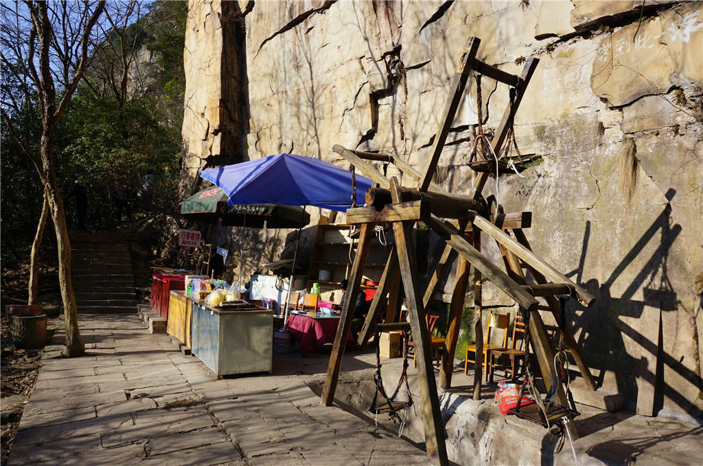 服务点,有土家秋千(每人10元12圈),还可以寄存行李,3元一件——因为去乌龙寨天波府是要原路返回的,有段上山路比较陡峭,还有一线天,背着大包肯定不方便,所以摆摊的山民就乘机做起了这个生意。