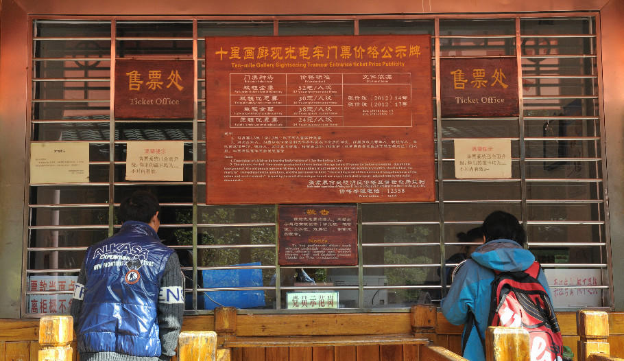 【天子山门票站】:天子山门票站距离 张家界 市区较远,车程要比去森林公园、 武陵源 门票站多25分钟左右,而且车次较少,其它去景区的车都是10分钟一班,只有到天子山门票站的是半小时一班。车费13元,75分钟可到达。这一门票站的优点是,进门后直接坐环保车,12分钟后可达天子山景区山顶,然后可以转坐环保车去景区的任何地方。省去了乘坐百龙天梯或缆车上山的钱,而且免去了排队、徒步的时间。