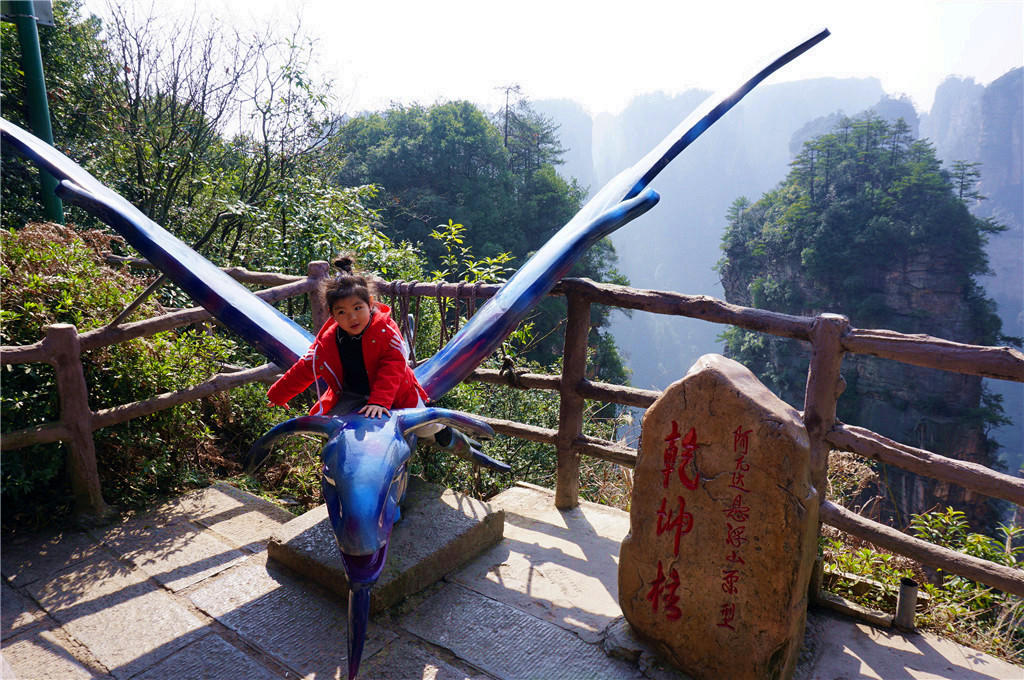 很多小朋友骑上魅影拍照,而我这个大朋友只好拍别的小女孩了。后面那个山头就是乾坤柱了。