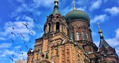 始建于1907年的圣索菲亚大教堂是哈尔滨的地标性建筑,绿色的洋葱头式大穹顶十分引人注目。