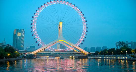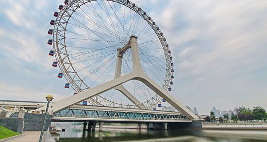 天津之眼坐落在天津市红桥区海河畔,是一座跨河建设、桥轮合一的摩天轮,兼具观光和交通功用。
